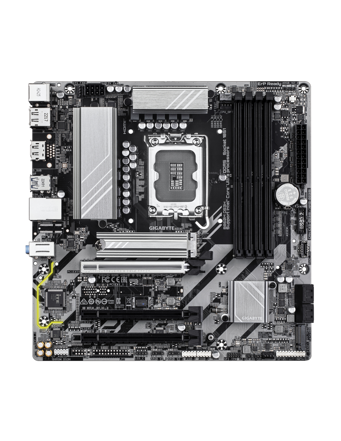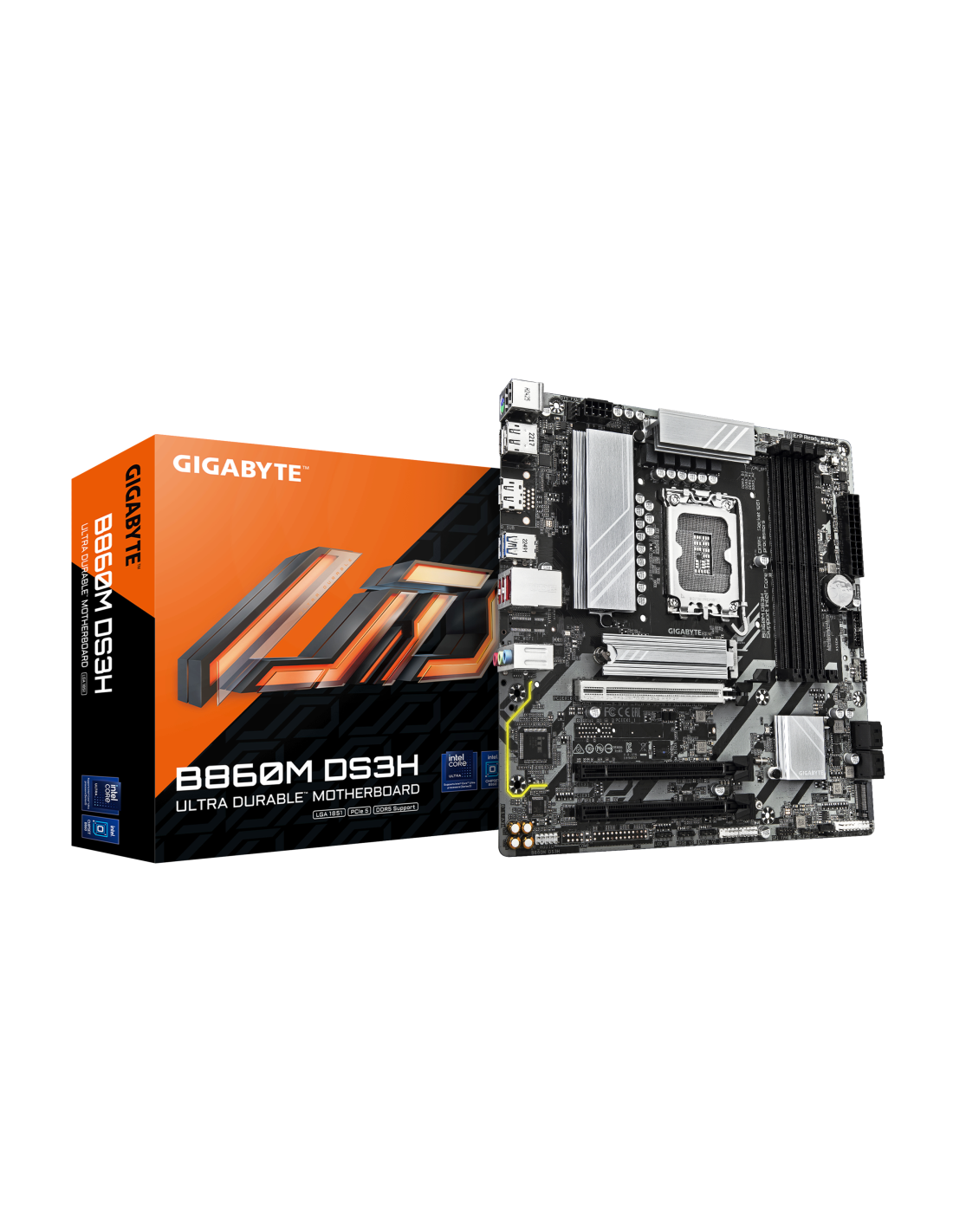 GIGABYTE B860M DS3H Placa base - CPUs Intel Core Ultra, VRM de 5+1+2+1 fases, hasta 9066MHz DDR5, 1xPCIe 5.0 + 1xPCIe 4.0 M.2, LAN 2,5 GbE, USB 3.2 Gen 2. Fabricante de procesador: Intel, Socket de procesador: LGA 1851 (Socket V1), Procesador compatible: Intel Core Ultra (Serie 1), Intel Core Ultra (Series 2). tipos de memoria compatibles: DDR5-SDRAM, Memoria interna máxima: 256 GB, Tipo de ranuras de memoria: DIMM. Interfaces de disco de almacenamiento soportados: M.2, SATA III, Tipos de unidades de almace