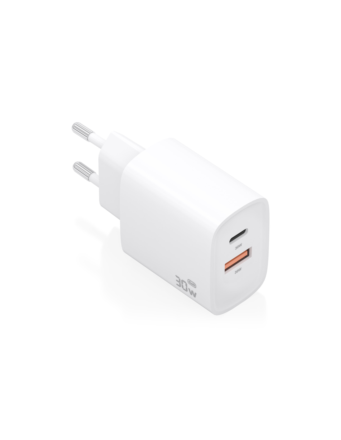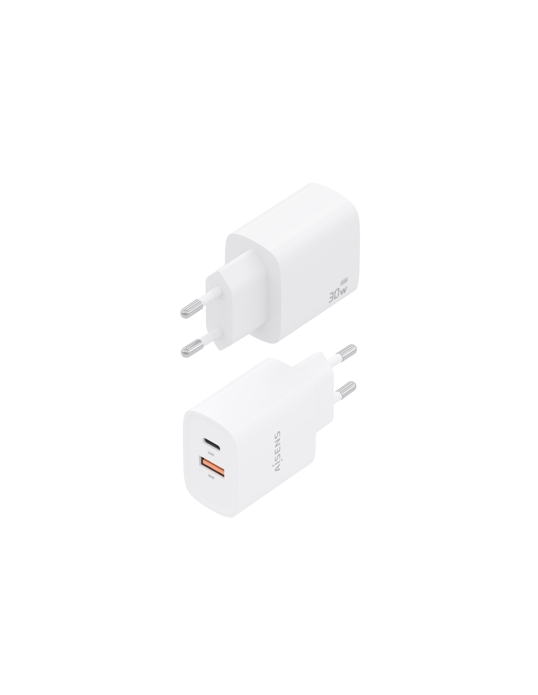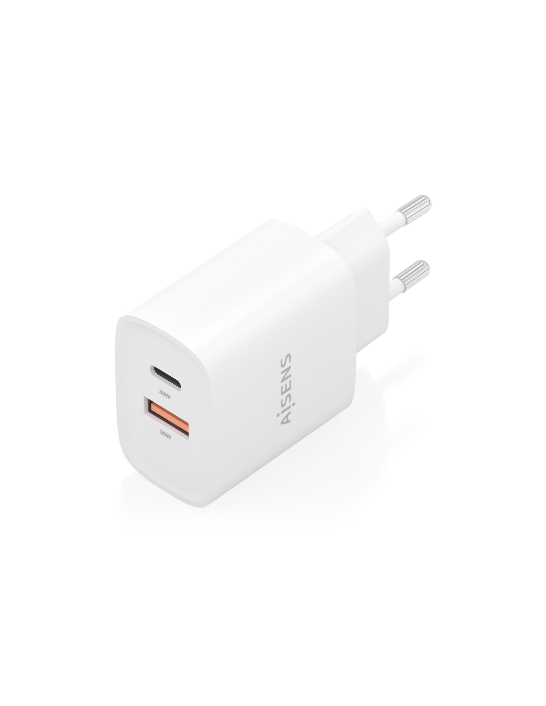 AISENS Cargador GaN 30W, 1xUSB-C PD3.0 QC4.0, 1xUSB-A QC3.0, Blanco