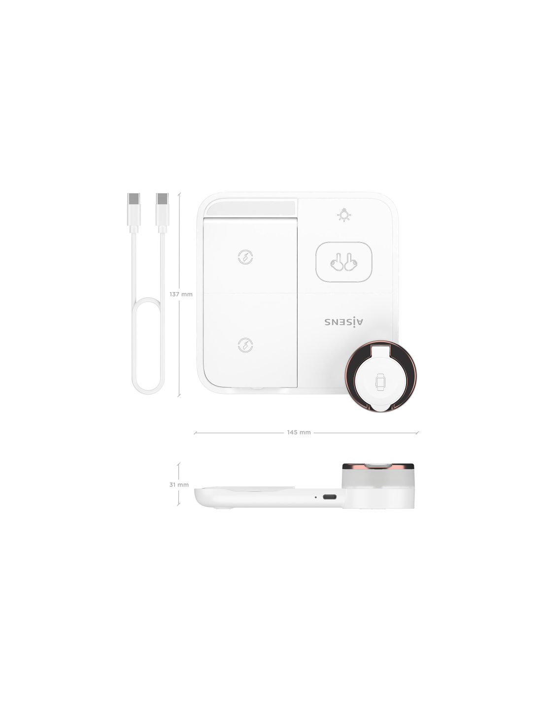 AISENS Cargador Inalambrico USB-C 4 en 1 De 15W Para Movil, Apple Watch, Auriculares Con Estuche De Carga, Blanco. Tipo de cargador: Interior, Alimentación: USB, Compatibilidad del cargador: Auriculares, Smartphone, Reloj inteligente, Número de puertos USB Tipo C: 1, Cargador inalámbrico, Funciones de protección de poder: Sobreintensidad, Sobrevoltaje, Sobrecalentamiento. Color del producto: Blanco