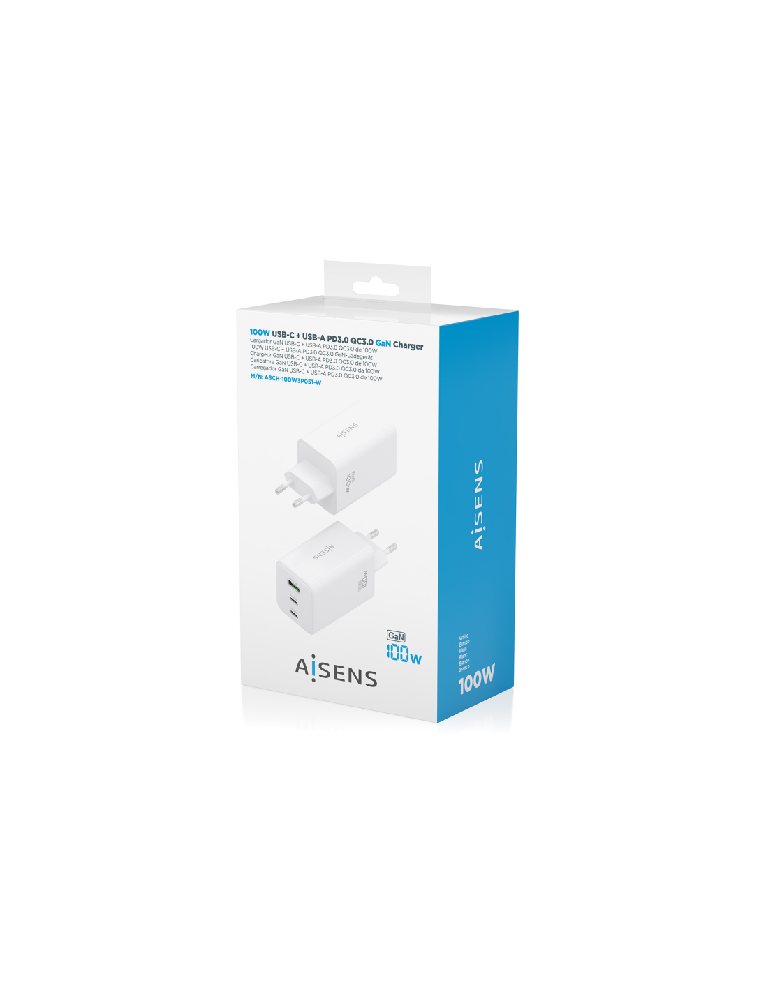 AISENS Cargador GaN 100W, 2x USB-C PD3.0 QC4.0 QC5.0, 1x USB-A QC3.0, Blanco. Tipo de cargador: Interior, Alimentación: Corriente alterna, Compatibilidad del cargador: Universal. Voltaje de entrada: 100 - 240 V, Voltaje de salida máximo: 20 V, Corriente de salida de adaptador AC: 5 A. Cantidad de puertos USB 2.0: 1, Número de puertos USB Tipo C: 2, Carga rápida, Funciones de protección de poder: Sobrecarga, Sobrecarga, Cortocircuito. Color del producto: Blanco