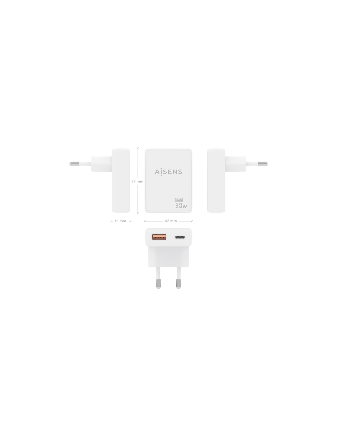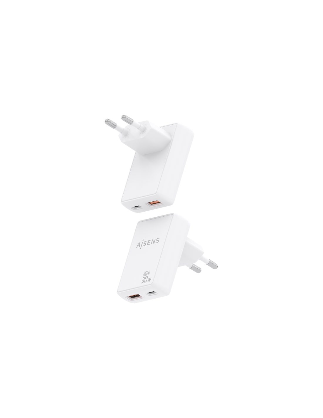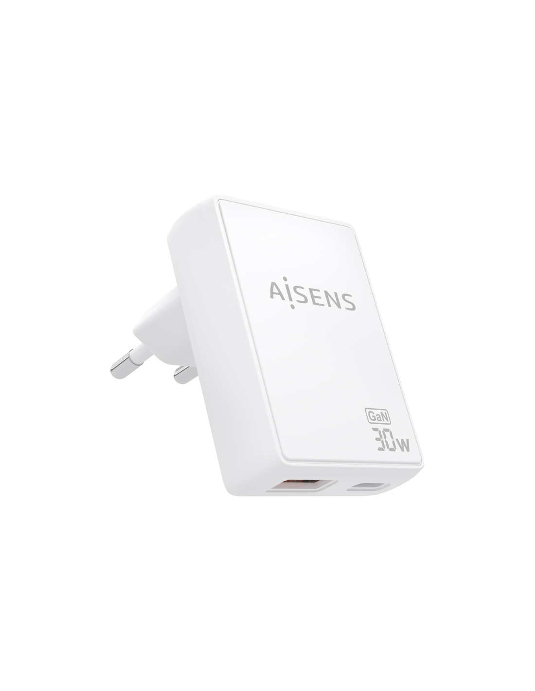 AISENS Cargador De Pared GaN Ultra Delgado 30W, 1xUSB-C PD3.0 QC4.0, 1xUSB-A QC3.0, Blanco