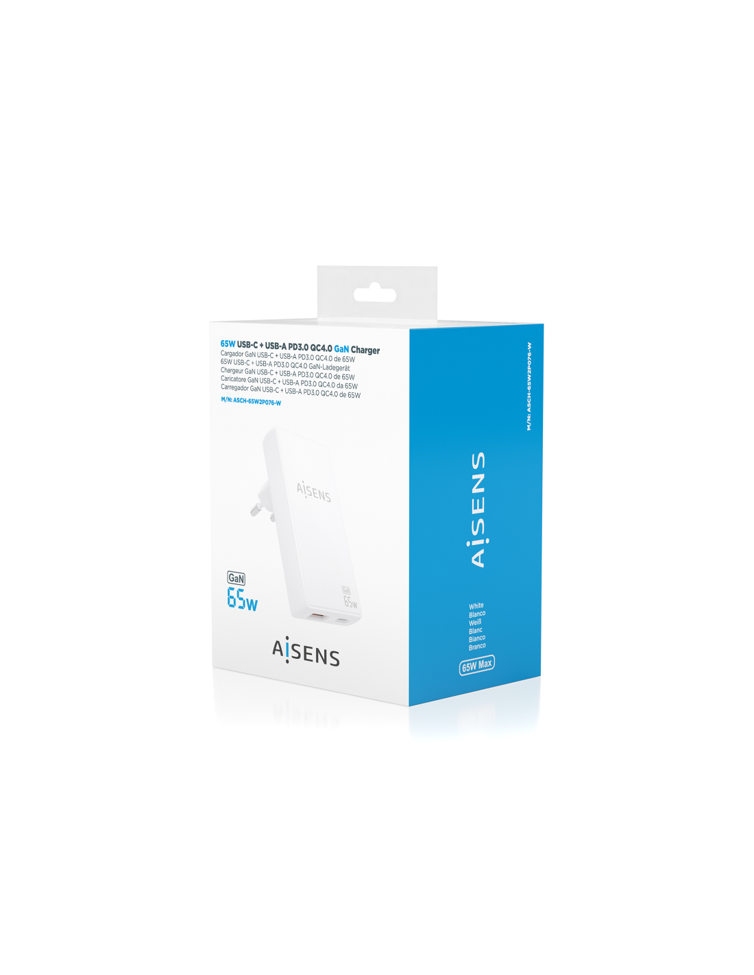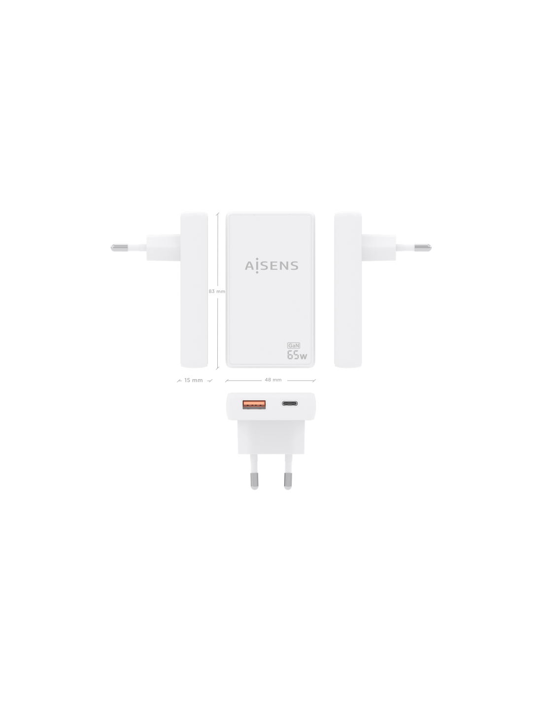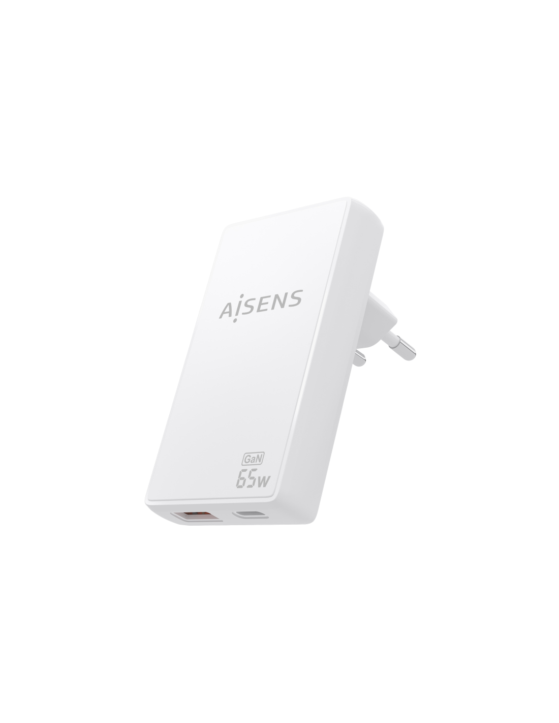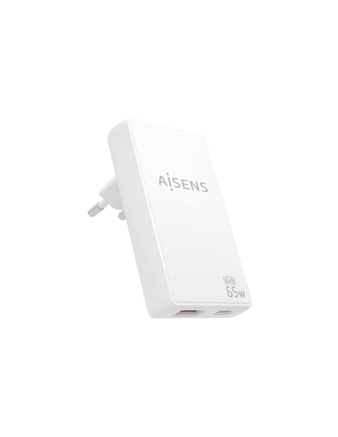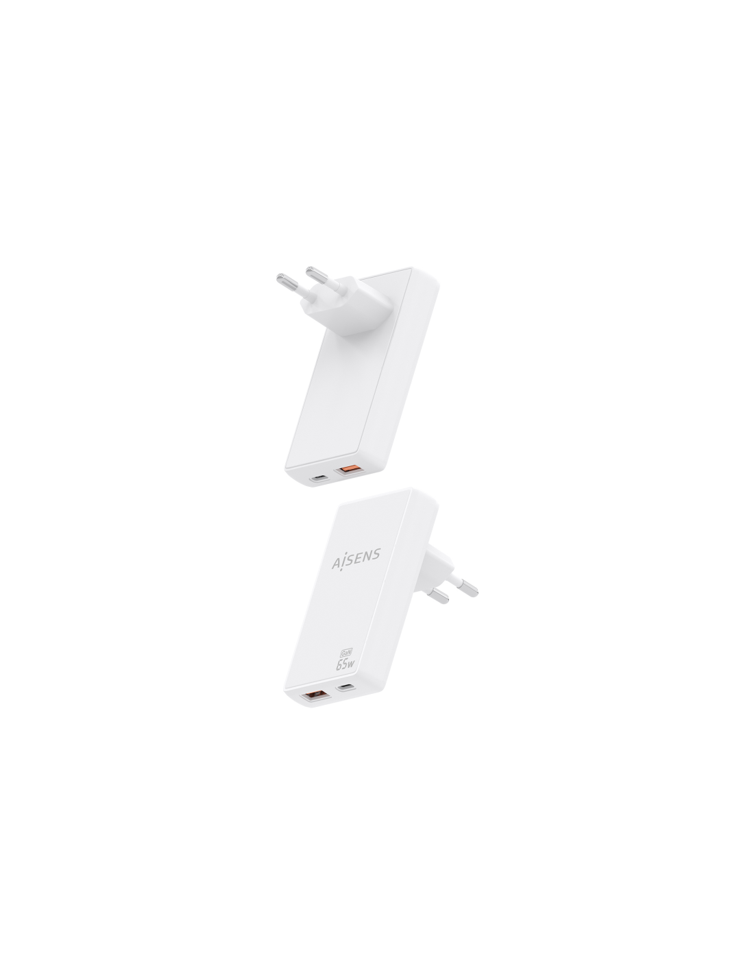 AISENS Cargador De Pared GaN Ultra Delgado 65W, 1xUSB-C PD3.0 QC4.0, 1xUSB-A QC3.0, Blanco