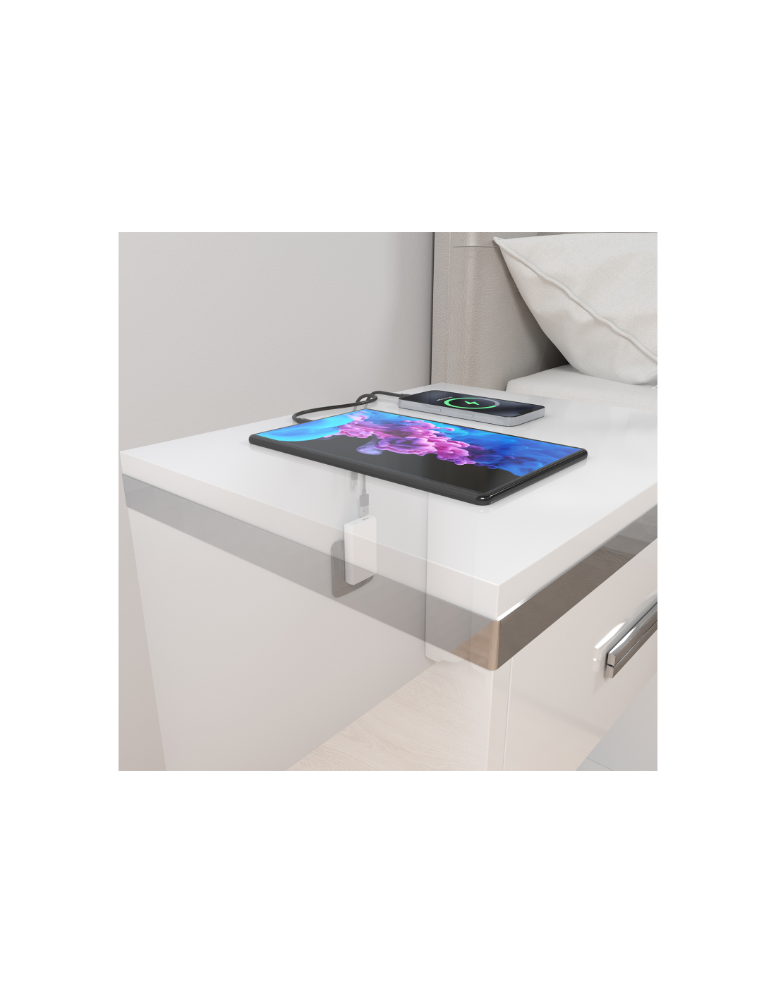 > Su diseño ultradelgado y ajustado a la pared permite colocarlo fácilmente detrás de muebles como mesas de noche, sofás o sillas, sin ocupar espacio ni estorbar.