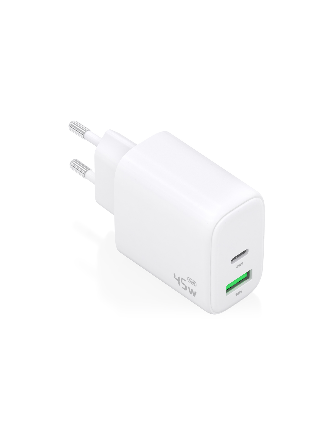 AISENS Cargador GaN 45W, 1xUSB-C PD3.0 QC4.0, 1xUSB-A QC3.0, Blanco. Tipo de cargador: Interior, Alimentación: Corriente alterna, Compatibilidad del cargador: Cámara digital, GPS, Teléfono móvil, Portátil, Smartphone, Tableta, Universal. Voltaje de entrada: 100 - 240 V, Voltaje de salida máximo: 20 V. Número de puertos USB Tipo C: 1, Carga rápida, Funciones de protección de poder: Sobrecarga, Cortocircuito. Color del producto: Blanco