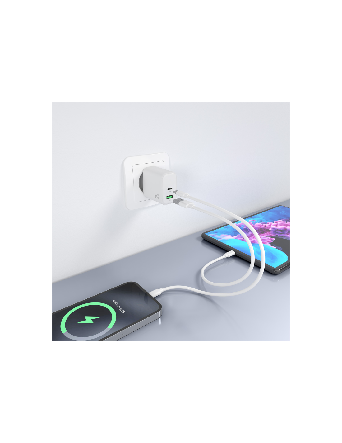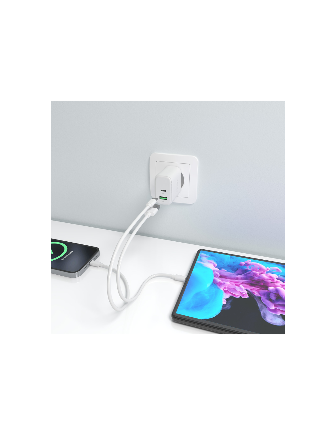 > Este cargador puede cargar simultáneamente 2 dispositivos USB-A y USB-C a máxima velocidad.
