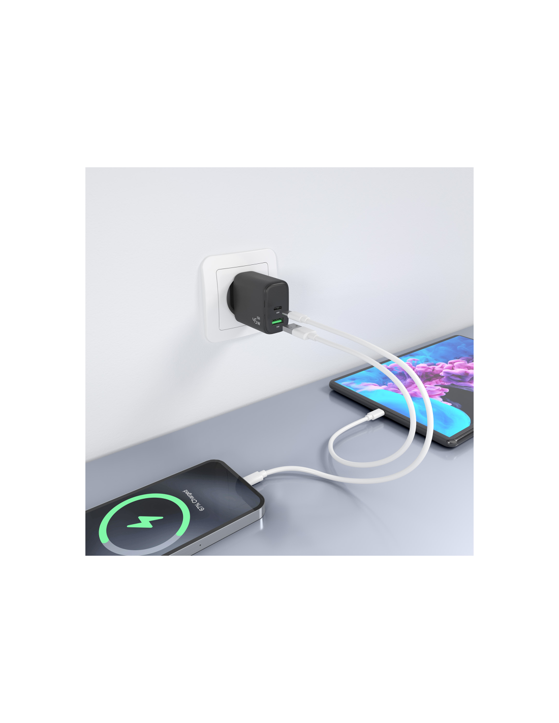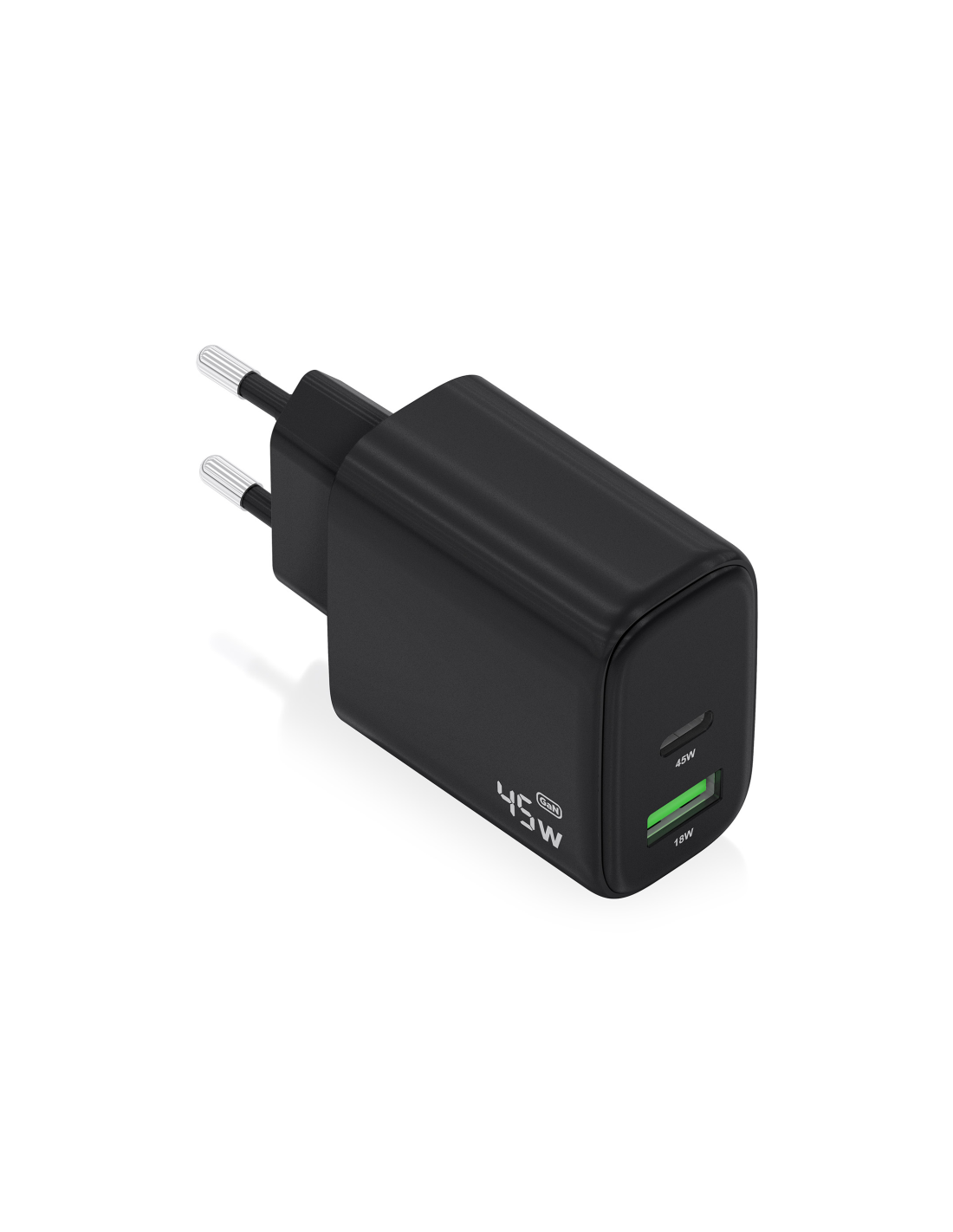 > Cargador GaN USB-C 45W para cargar portátiles, móviles, cámaras y tablets etc. Diseño muy elegante, moderno y práctico.