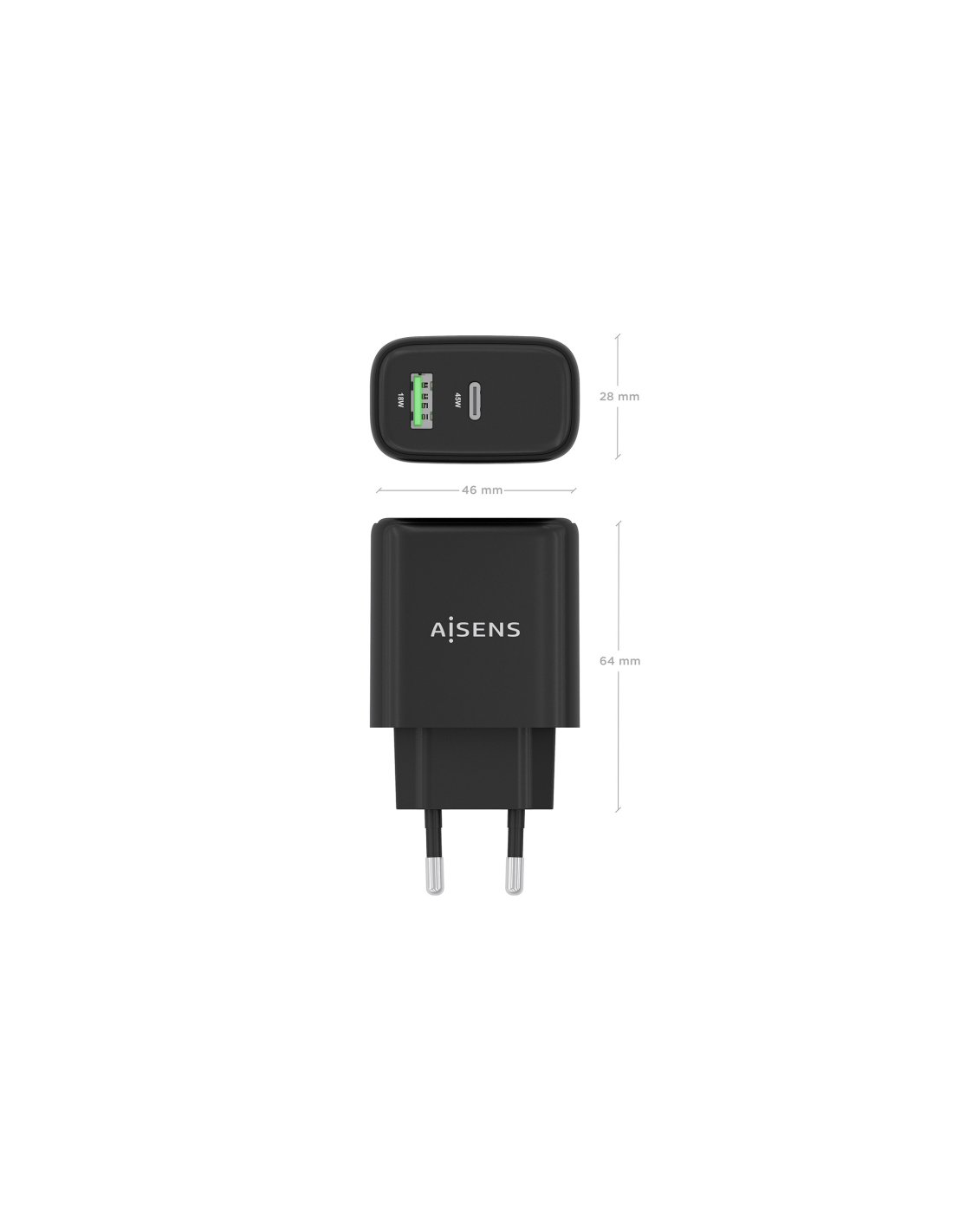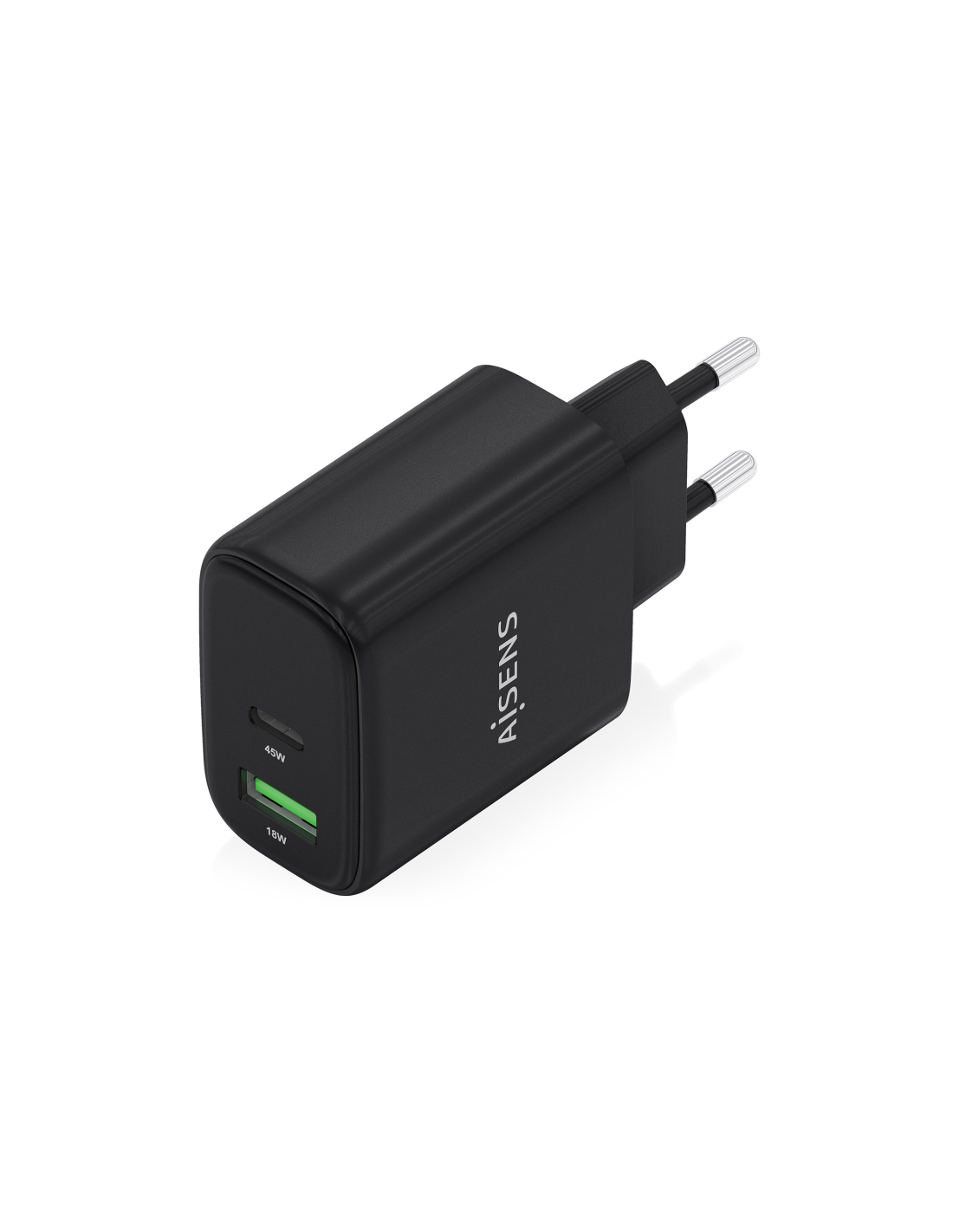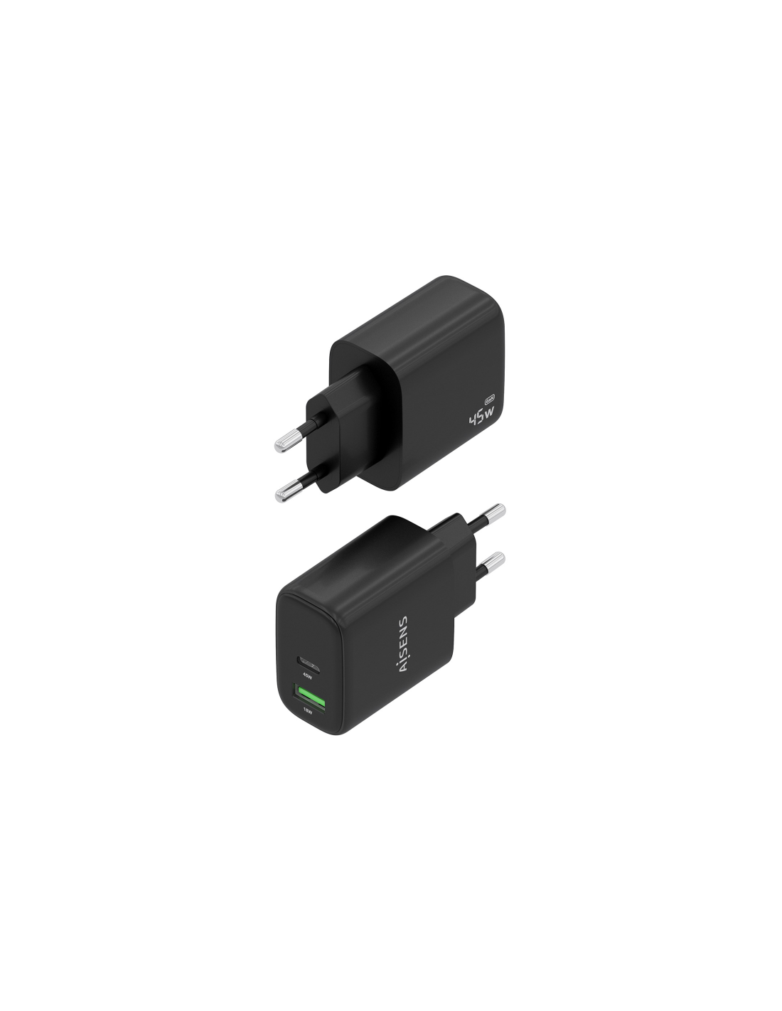 AISENS Cargador GaN 45W, 1xUSB-C PD3.0 QC4.0, 1xUSB-A QC3.0, Negro