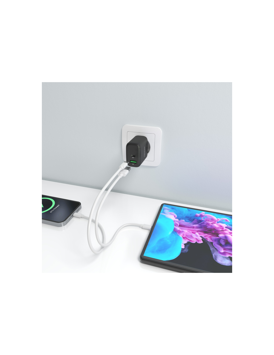 > Este cargador puede cargar simultáneamente 2 dispositivos USB-A y USB-C a máxima velocidad.