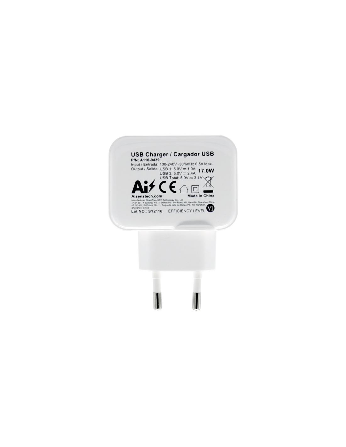 AISENS Cargador USB 17W 5V/3.4A, 2xUSB Con Control AI, Blanco. Tipo de cargador: Interior, Alimentación: Corriente alterna, Compatibilidad del cargador: Universal. Voltaje de entrada: 100 - 240 V, Voltaje de salida máximo: 5 V, Corriente de salida de adaptador AC: 3,4 A. Cantidad de puertos USB 2.0: 2. Color del producto: Blanco