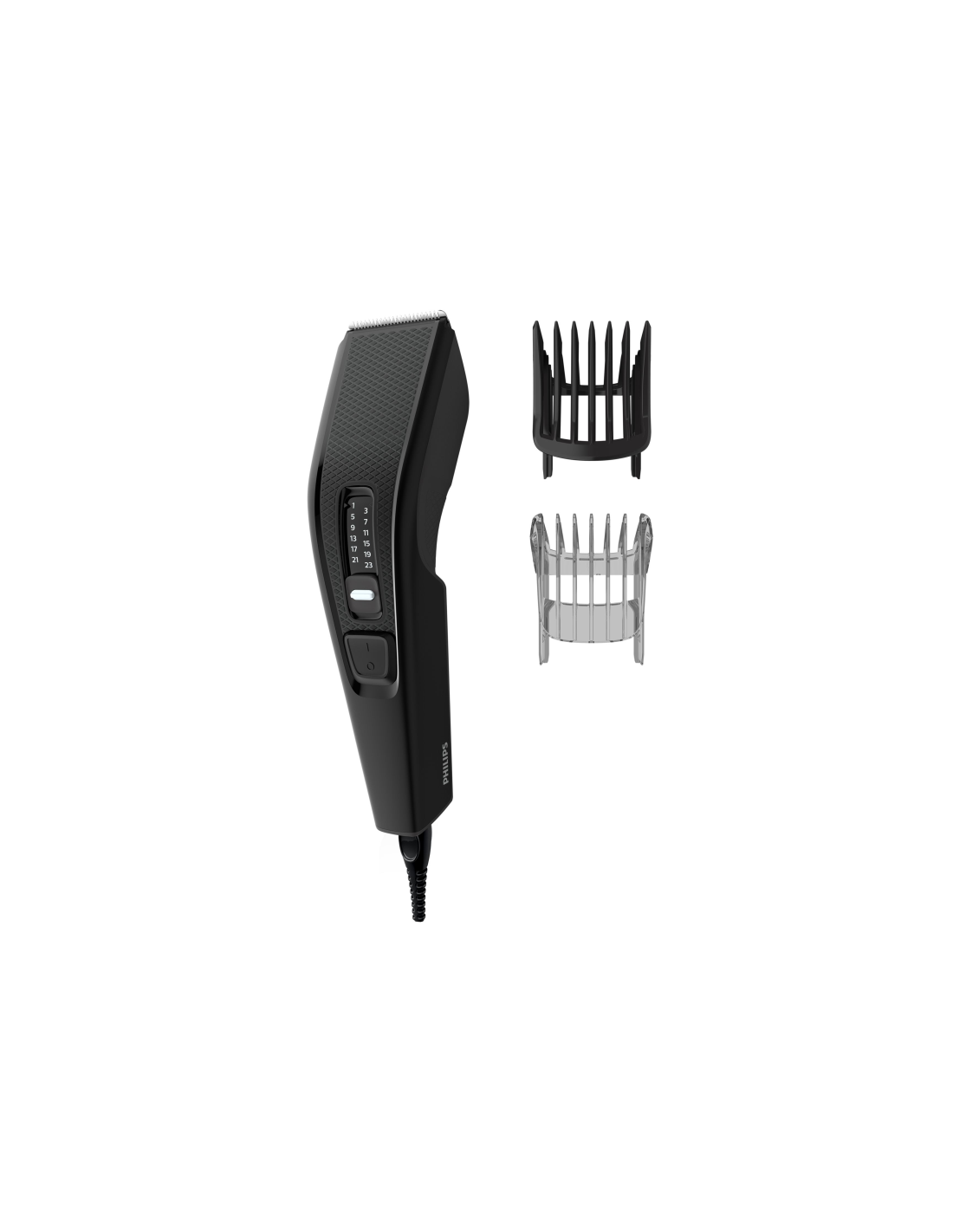 Philips 3000 series Cortapelos con cuchillas de acero inoxidable. Color del producto: Negro, Longitud mínima del cabello: 0,5 mm, Longitud máxima del cabello: 2,3 cm. Fuente de energía: Corriente alterna, Voltaje de entrada AC: 100 - 240 V. Ancho: 70 mm, Profundidad: 140 mm, Altura: 224 mm. Peines accesorios: Barba