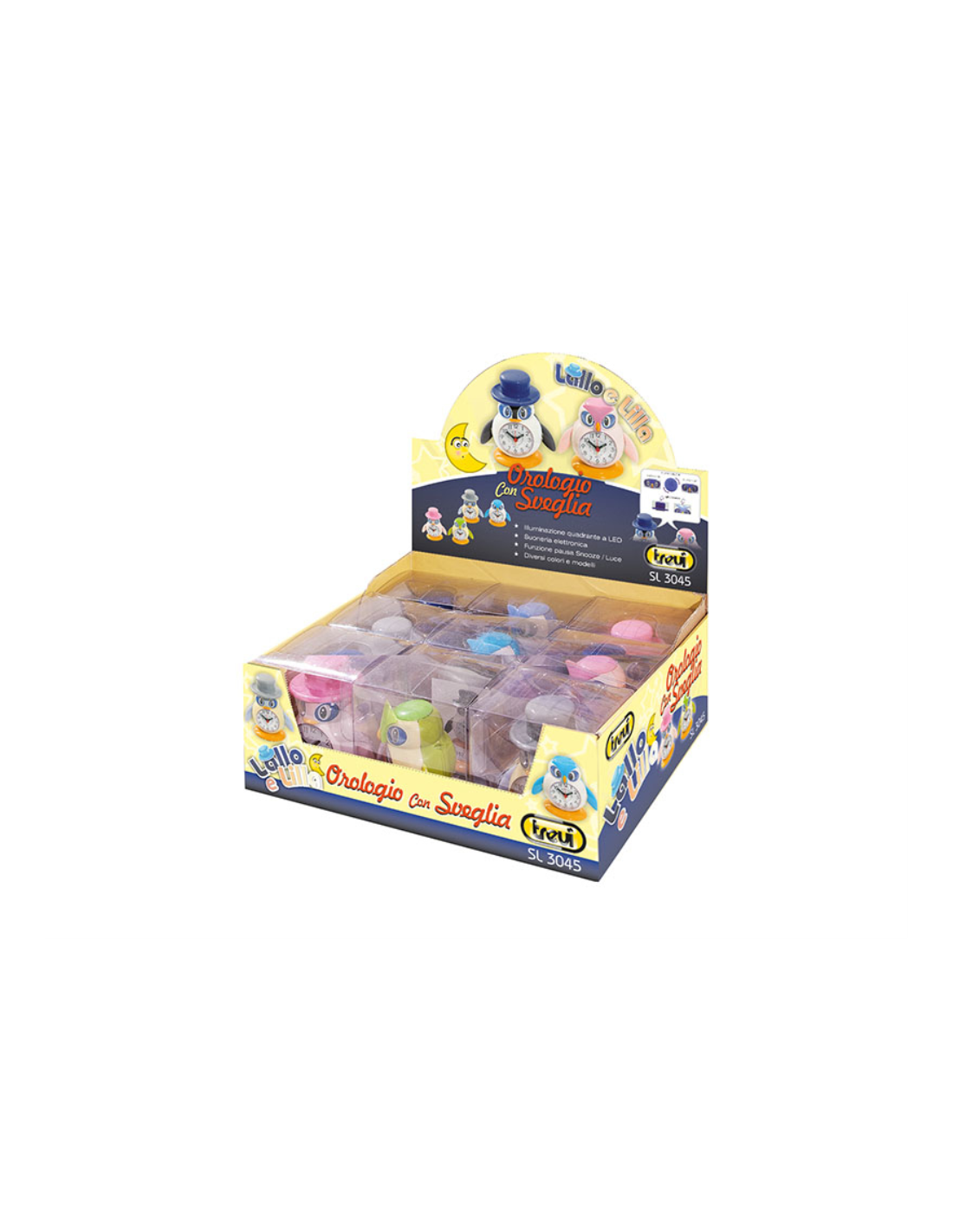 Trevi SL 3045. Tipo: Reloj despertador analógico, Color del producto: Multicolor. Fuente de energía: Batería, Tipo de batería: AAA. Ancho: 100 mm, Altura: 70 mm, Profundidad: 110 mm. Cantidad por paquete: 9 pieza(s), Ancho del paquete: 310 mm, Profundidad del paquete: 110 mm