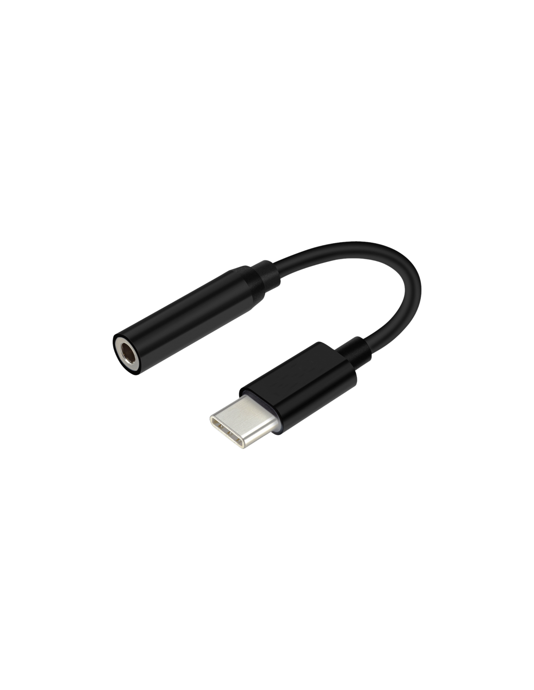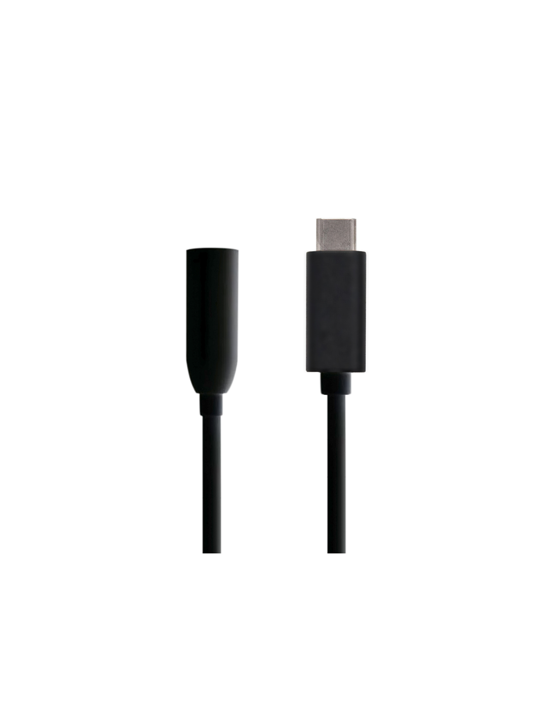 Conversor USB-C a AUDIO, con conector USB-C en un extremo y JACK 3.5 4 pines hembra en el otro.