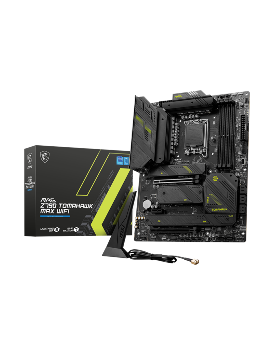 MSI Z790 TOMAHAWK MAX WIFI. Fabricante de procesador: Intel, Socket de procesador: LGA 1700, Procesador compatible: Intel® Celeron®, Intel® Pentium® Gold. tipos de memoria compatibles: DDR5-SDRAM, Memoria interna máxima: 128 GB, Canales de memoria: Doble canal. Interfaces de disco de almacenamiento soportados: M.2, PCI Express, Tipos de unidades de almacenamiento admitidas: HDD & SSD, Capacidad de almacenamiento interno: 10 GB. Tipo de interfaz ethernet: 2.5 Gigabit Ethernet, Estándar Wi-Fi: Wi-Fi 6 (802.11ax), Wi-Fi estándares: 802.11a, 802.11b, 802.11g, Wi-Fi 4 (802.11n), Wi-Fi 5 (802.11ac), Wi-Fi 6 (802.11ax). Componente para: PC, Factor de forma: ATX, Familia del chipset: Intel