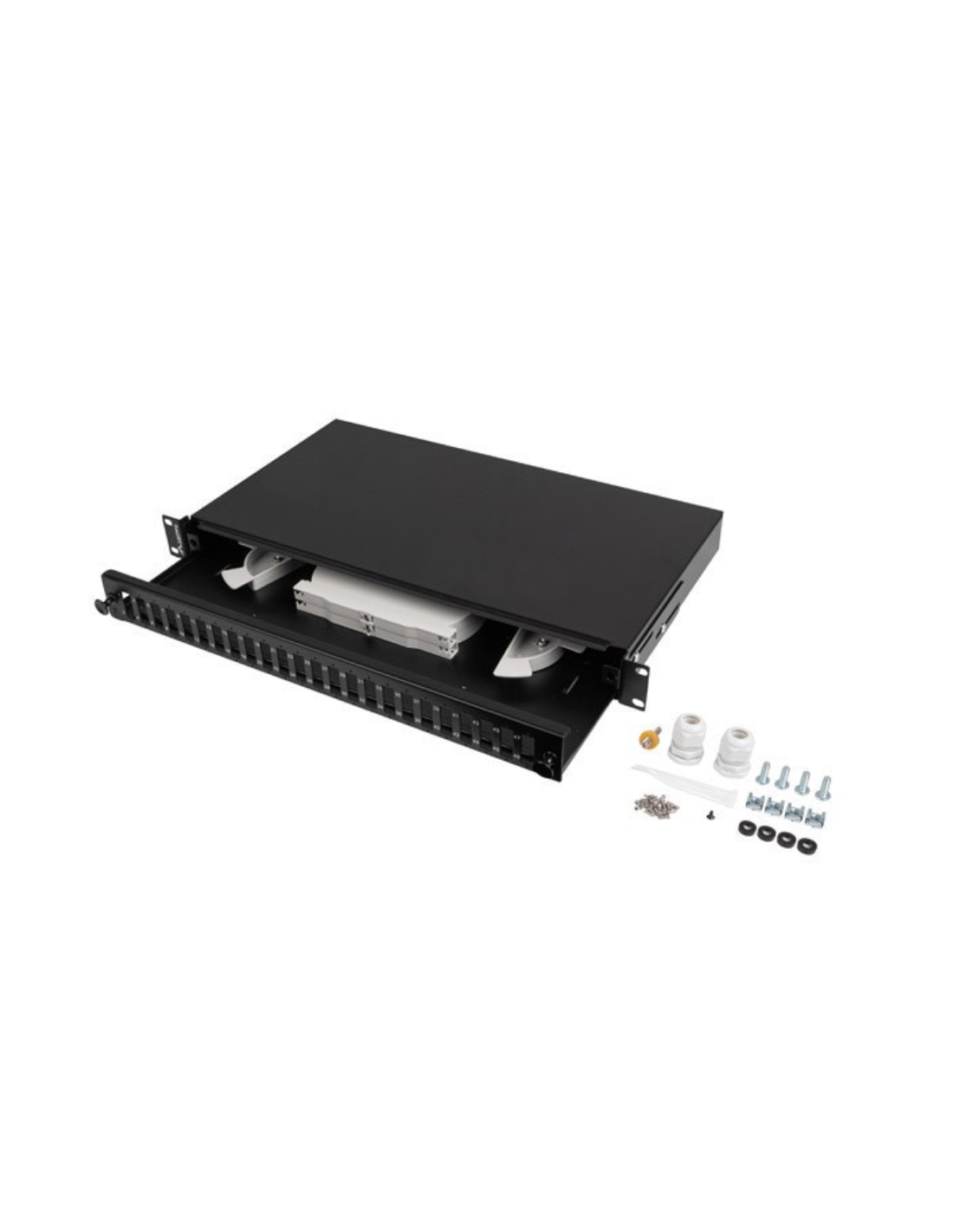 Lanberg FOP1-24SD-LQB. Color del producto: Negro, Material: Acero, Montaje: Montaje en bastidor. Ancho: 482,6 mm, Altura: 44,5 mm, Profundidad: 242 mm