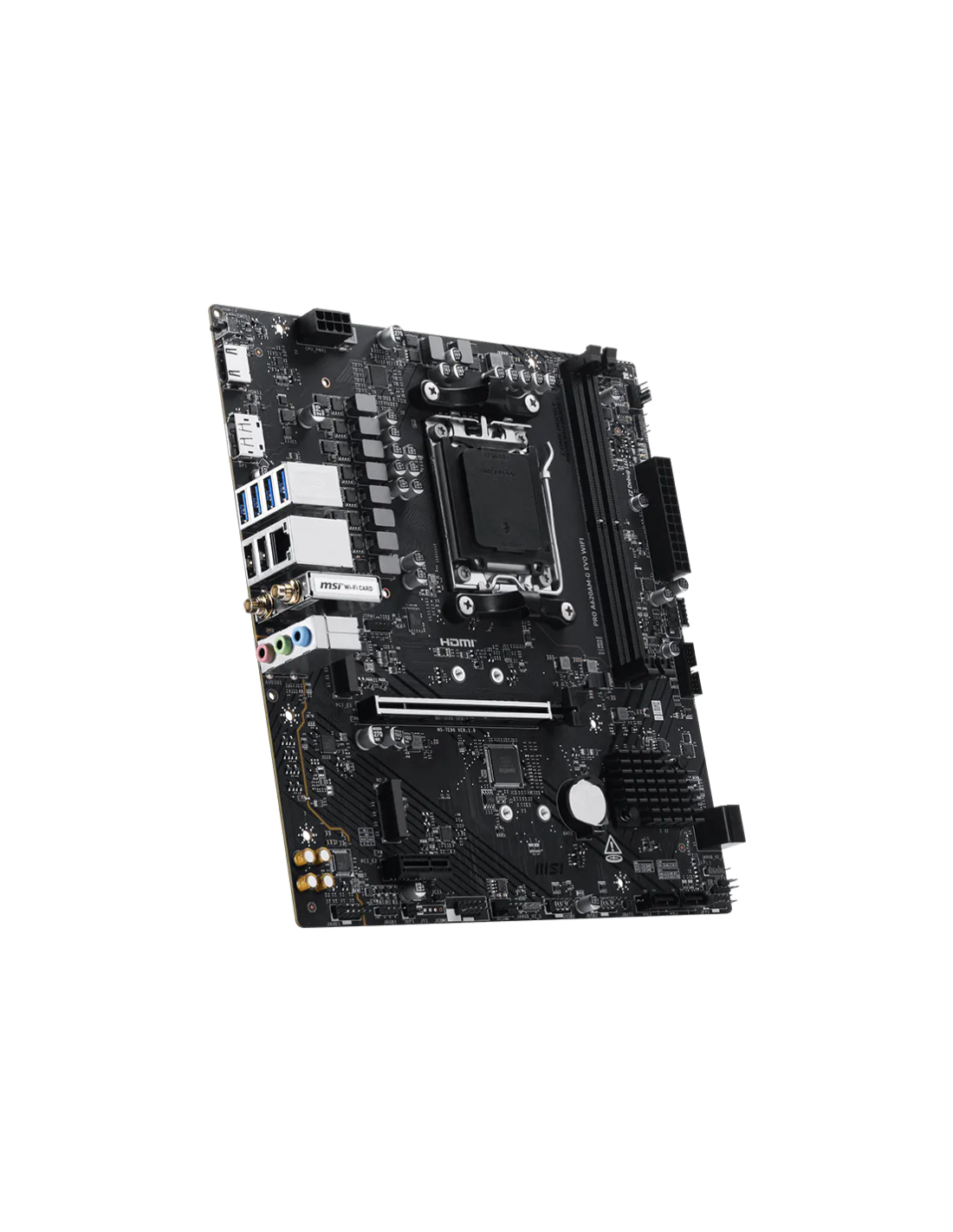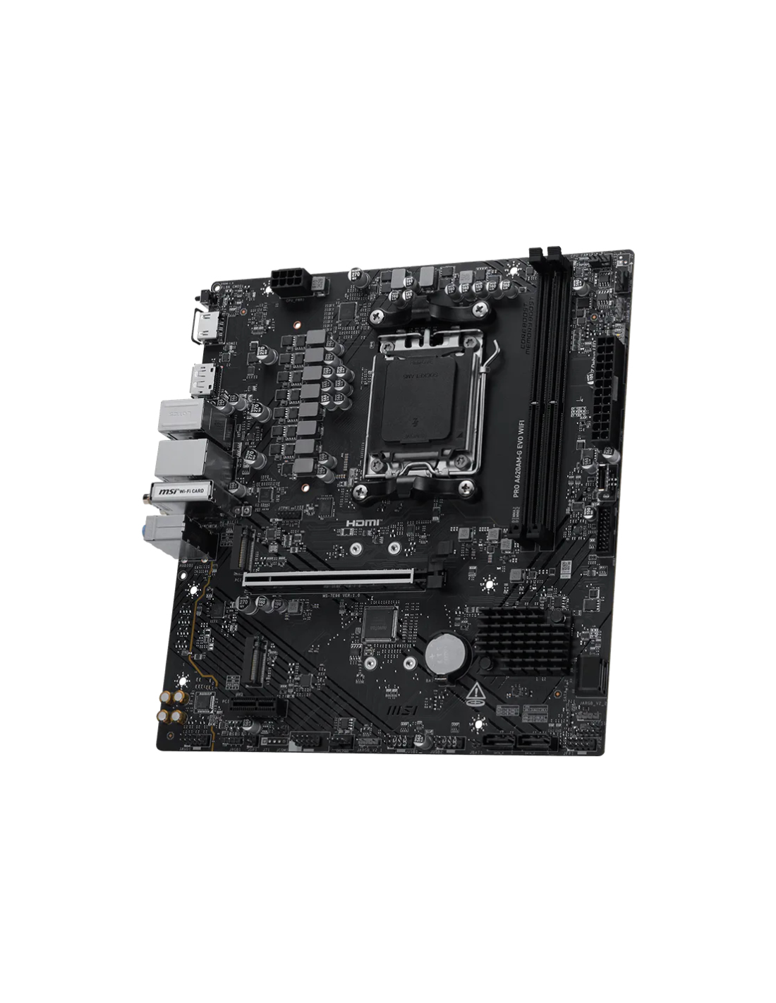 MSI Pro A620AM-G EVO WIFI. Fabricante de procesador: AMD, Socket de procesador: Zócalo AM5, Procesador compatible: AMD Ryzen 7000 Series, AMD Ryzen 8000 Series, AMD Ryzen 9000 Series. tipos de memoria compatibles: DDR5-SDRAM, Memoria interna máxima: 128 GB, Tipo de ranuras de memoria: DIMM. Interfaces de disco de almacenamiento soportados: M.2, SATA III, Niveles RAID: 0, 1, 10. Tipo de interfaz ethernet: 2.5 Gigabit Ethernet, Estándar Wi-Fi: Wi-Fi 6E (802.11ax), Wi-Fi estándares: Wi-Fi 6E (802.11ax), 802.11