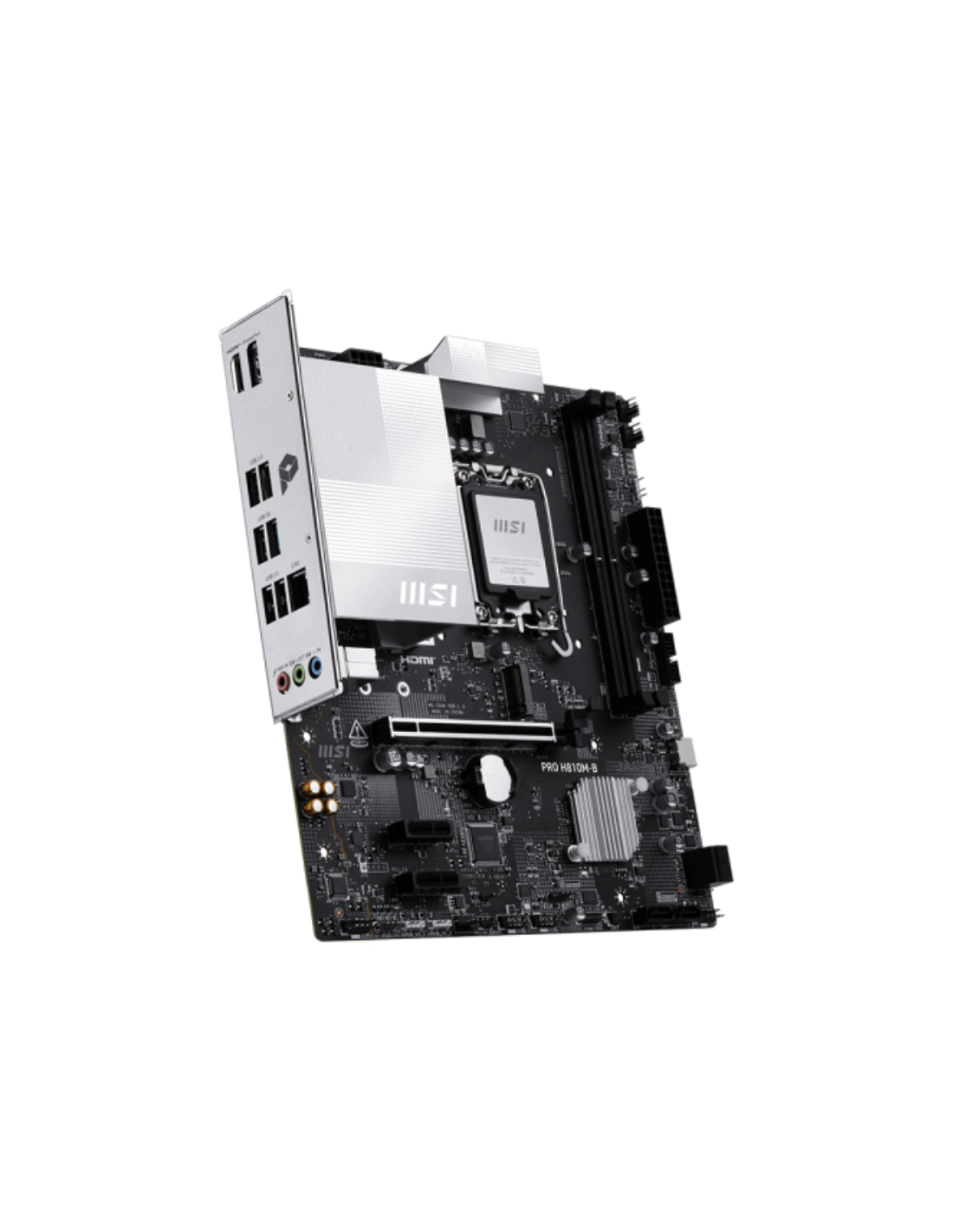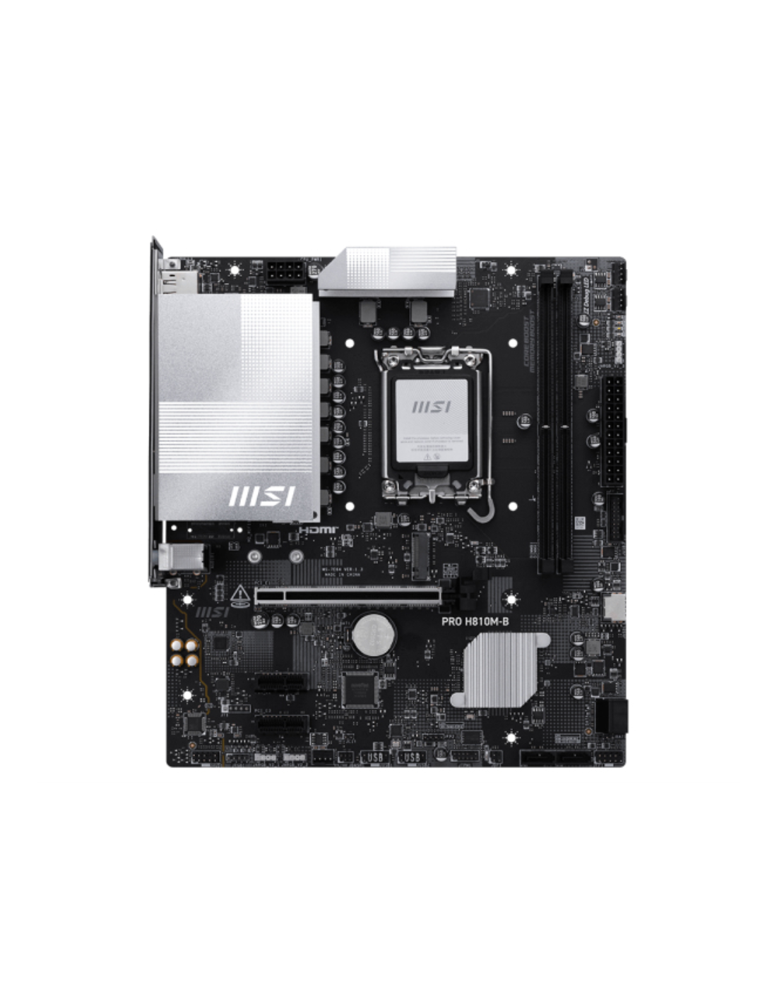 MSI PRO H810M-B. Fabricante de procesador: Intel, Socket de procesador: LGA 1851 (Socket V1), Procesador compatible: Intel Core Ultra (Series 2). tipos de memoria compatibles: DDR5-SDRAM, Memoria interna máxima: 128 GB, Compatibilidad de ECC: No-ECC. Interfaces de disco de almacenamiento soportados: SATA III, Tipos de unidades de almacenamiento admitidas: HDD & SSD. Tipo de interfaz ethernet: 2.5 Gigabit Ethernet. Componente para: PC, Factor de forma: micro ATX, Familia del chipset: Intel