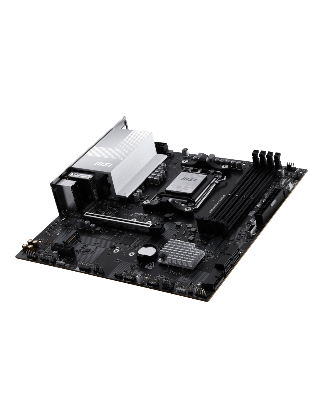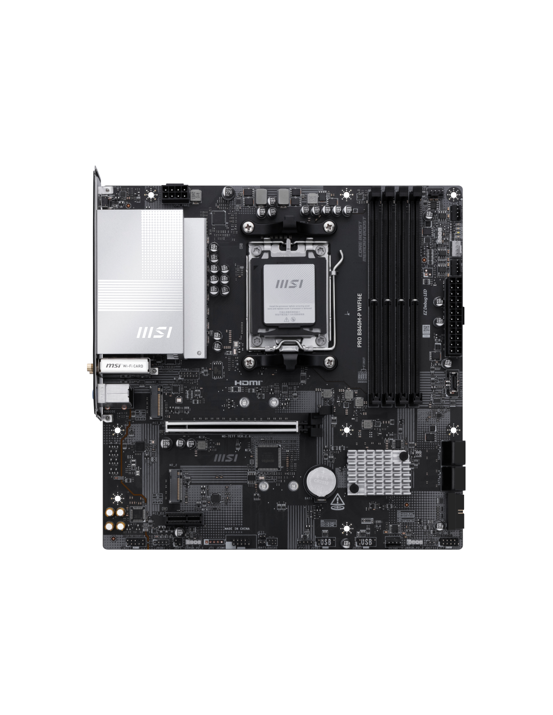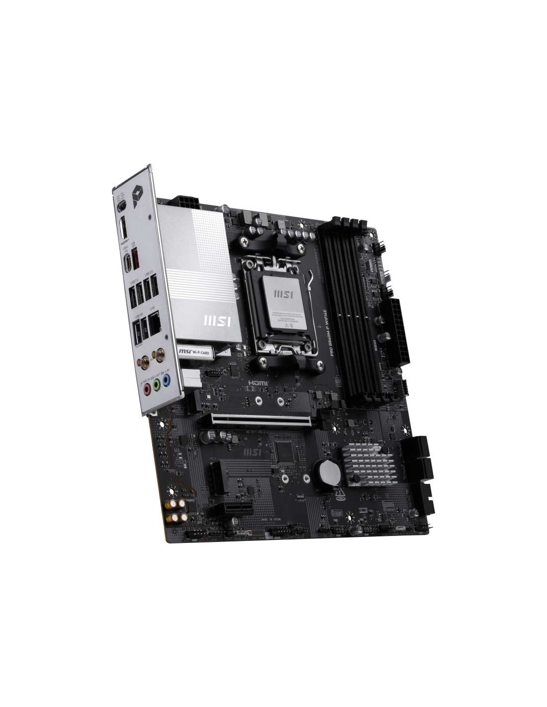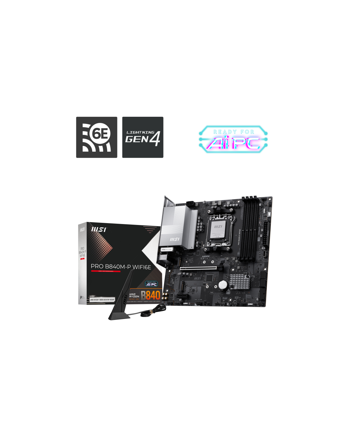 MSI PRO B840M-P WIFI6E. Fabricante de procesador: AMD, Socket de procesador: Zócalo AM5, Procesador compatible: AMD Ryzen 7000 Series, AMD Ryzen 8000 Series, AMD Ryzen 9000 Series. tipos de memoria compatibles: DDR5-SDRAM, Memoria interna máxima: 256 GB, Tipo de ranuras de memoria: DIMM. Interfaces de disco de almacenamiento soportados: M.2, Micro SATA III, Tipos de unidades de almacenamiento admitidas: HDD & SSD, Niveles RAID: 0, 1, 10. Tipo de interfaz ethernet: 2.5 Gigabit Ethernet, Controlador LAN: Real