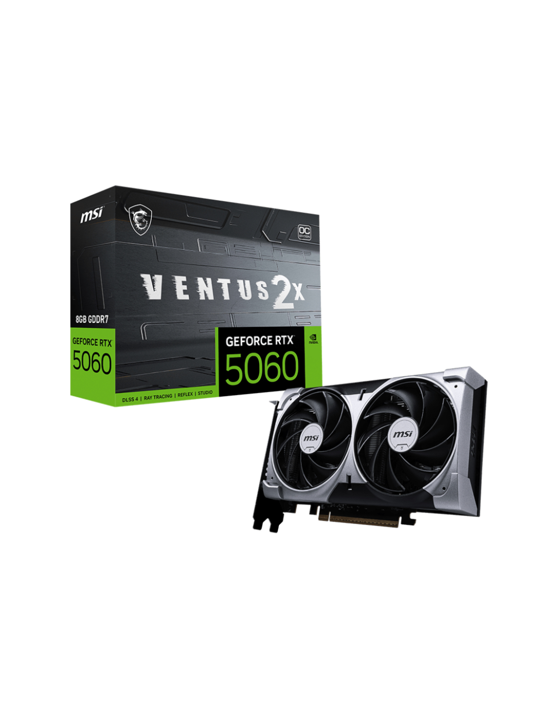 MSI GeForce RTX 5060 8G VENTUS 2X OC. Familia de procesadores de gráficos: NVIDIA, Procesador gráfico: GeForce RTX 5060. Capacidad memoria de adaptador gráfico: 8 GB, Tipo de memoria de adaptador gráfico: GDDR7, Ancho de datos: 128 bit. Máxima resolución: 7680 x 4320 Pixeles. Versión DirectX: 12 Ultimate, Versión OpenGL: 4.6. Tipo de interfaz: PCI Express x16 5.0. Tipo de enfriamiento: Activo, Número de ventiladores: 2 Ventilador(es)