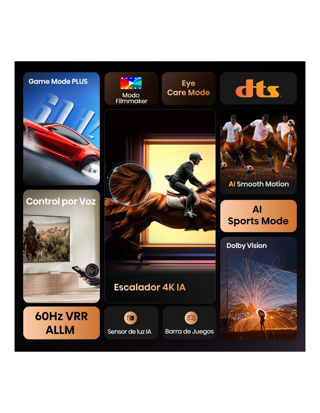 Alexa integrado, Modo juego Plus, DTS Virtual X, Control por voz televisor, Doble control de volumen, Auto ordenación canales TDT