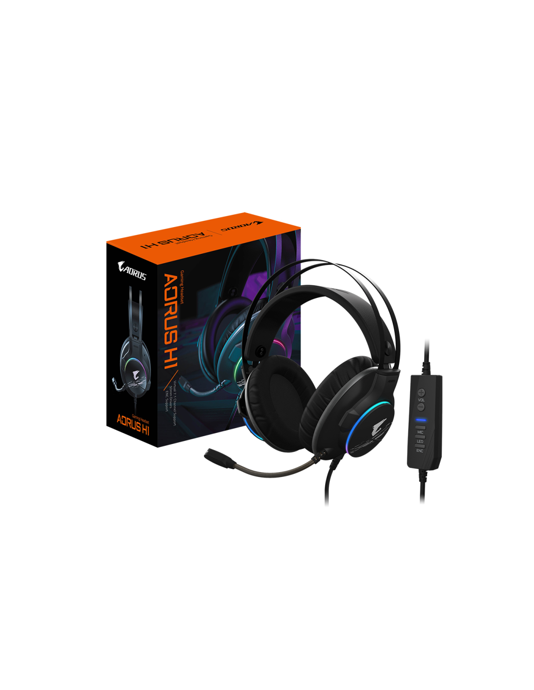 GIGABYTE AORUS H1. Tipo de producto: Auriculares. Tecnología de conectividad: Alámbrico. Uso recomendado: Juego. Frecuencia de auricular: 20 - 20000 Hz. Longitud de cable: 2,2 m. Peso: 290 g. Color del producto: Negro