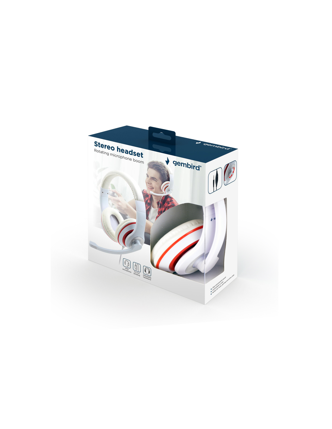 Gembird MHS-03-WTRD. Tipo de producto: Auriculares. Tecnología de conectividad: Alámbrico. Uso recomendado: Llamadas/Música. Frecuencia de auricular: 20 - 20000 Hz. Longitud de cable: 1,8 m. Peso: 200 g. Color del producto: Rojo, Blanco