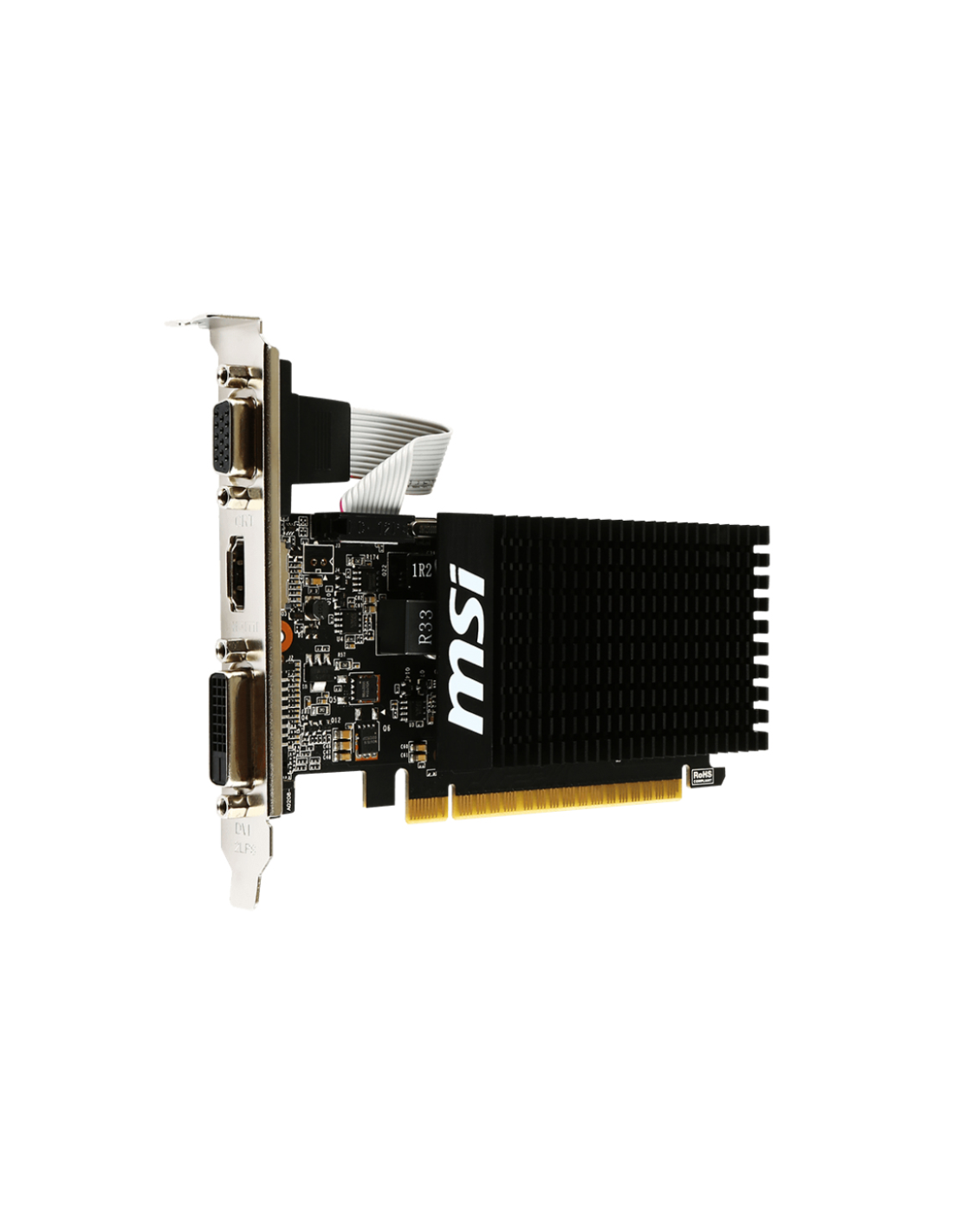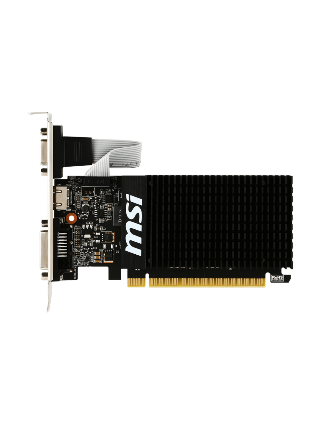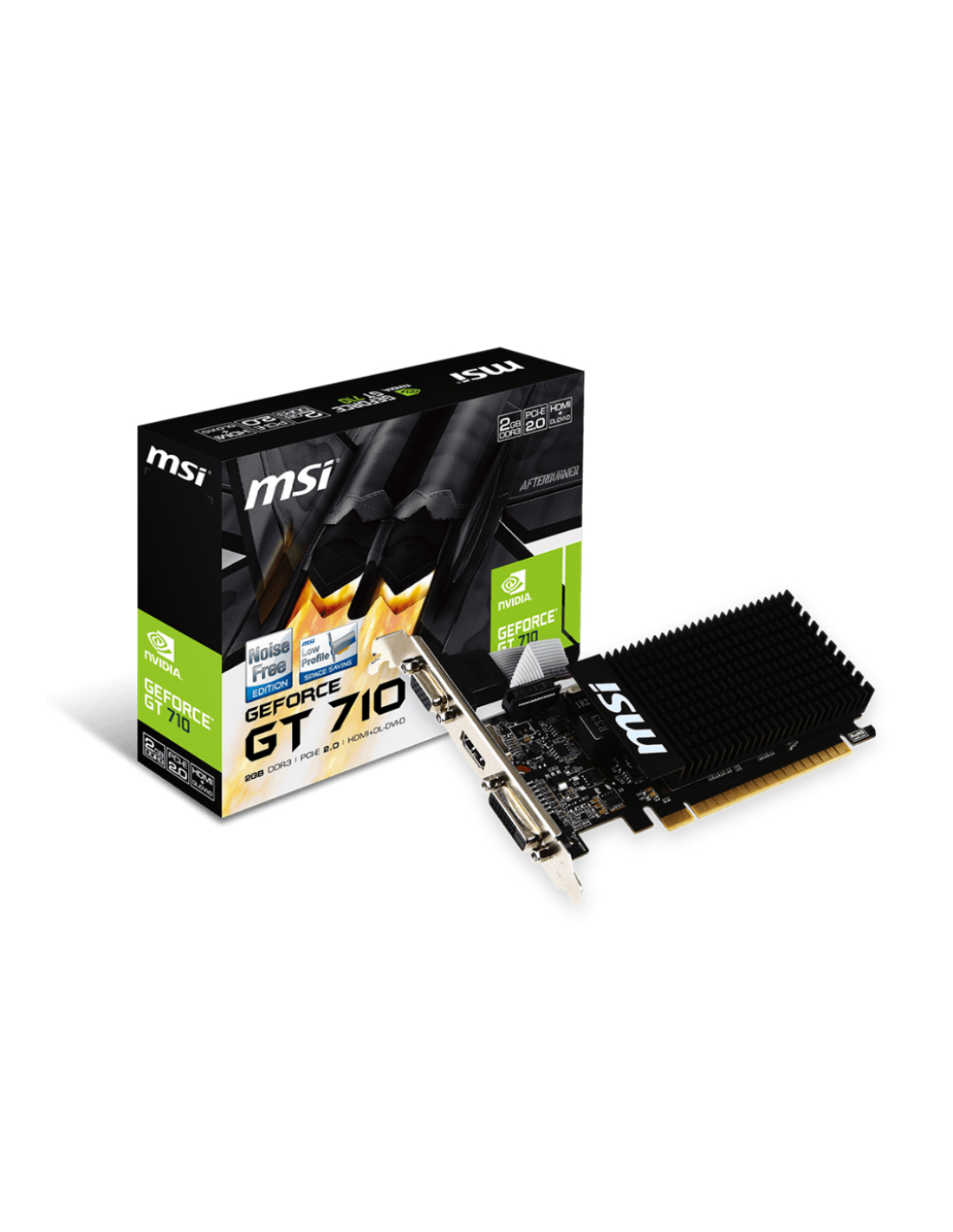 MSI 912-V809-2016. Familia de procesadores de gráficos: NVIDIA, Procesador gráfico: GeForce GT 710, Frecuencia del procesador: 954 MHz. Capacidad memoria de adaptador gráfico: 2 GB, Tipo de memoria de adaptador gráfico: GDDR3, Ancho de datos: 64 bit, Velocidad de memoria del reloj: 1600 MHz. Máxima resolución: 4096 x 2160 Pixeles. Versión DirectX: 12.0, Versión OpenGL: 4.5, Dual Link DVI. Tipo de interfaz: PCI Express 2.0. Tipo de enfriamiento: Pasivo