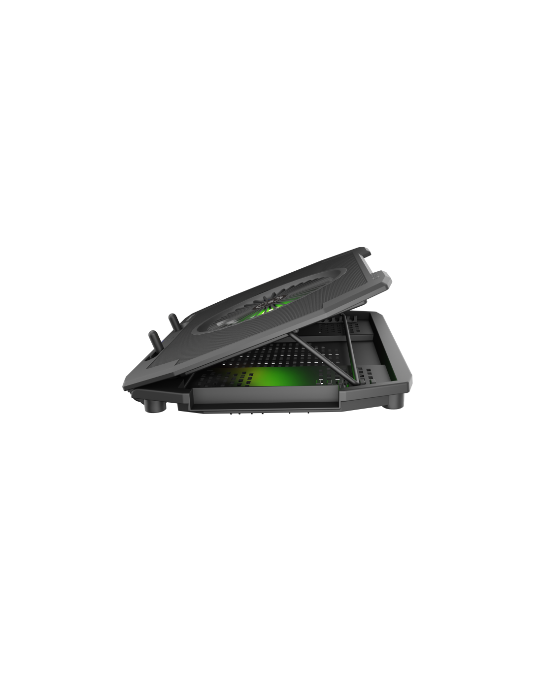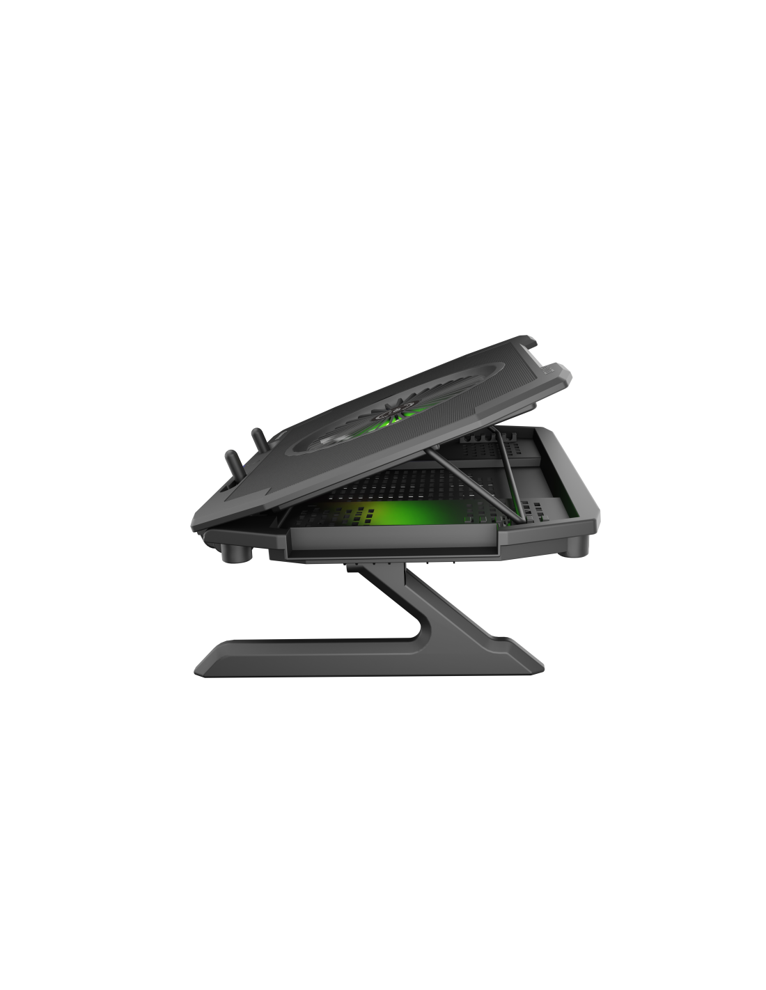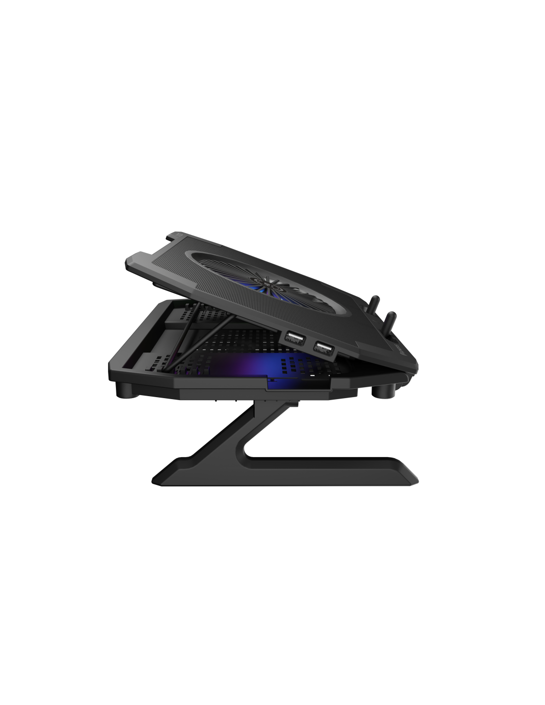 El soporte está equipado con un sistema de refrigeración eficaz y seguro basado en cuatro pequeños ventiladores que extraen el calor de debajo del portátil y un ventilador principal que introduce aire frío en el portátil. La ubicación correcta de los ventiladores garantiza una refrigeración extremadamente eficaz, y el control de velocidad de tres etapas de su rotación reducirá eficazmente la temperatura del portátil incluso durante las batallas más encarnizadas.