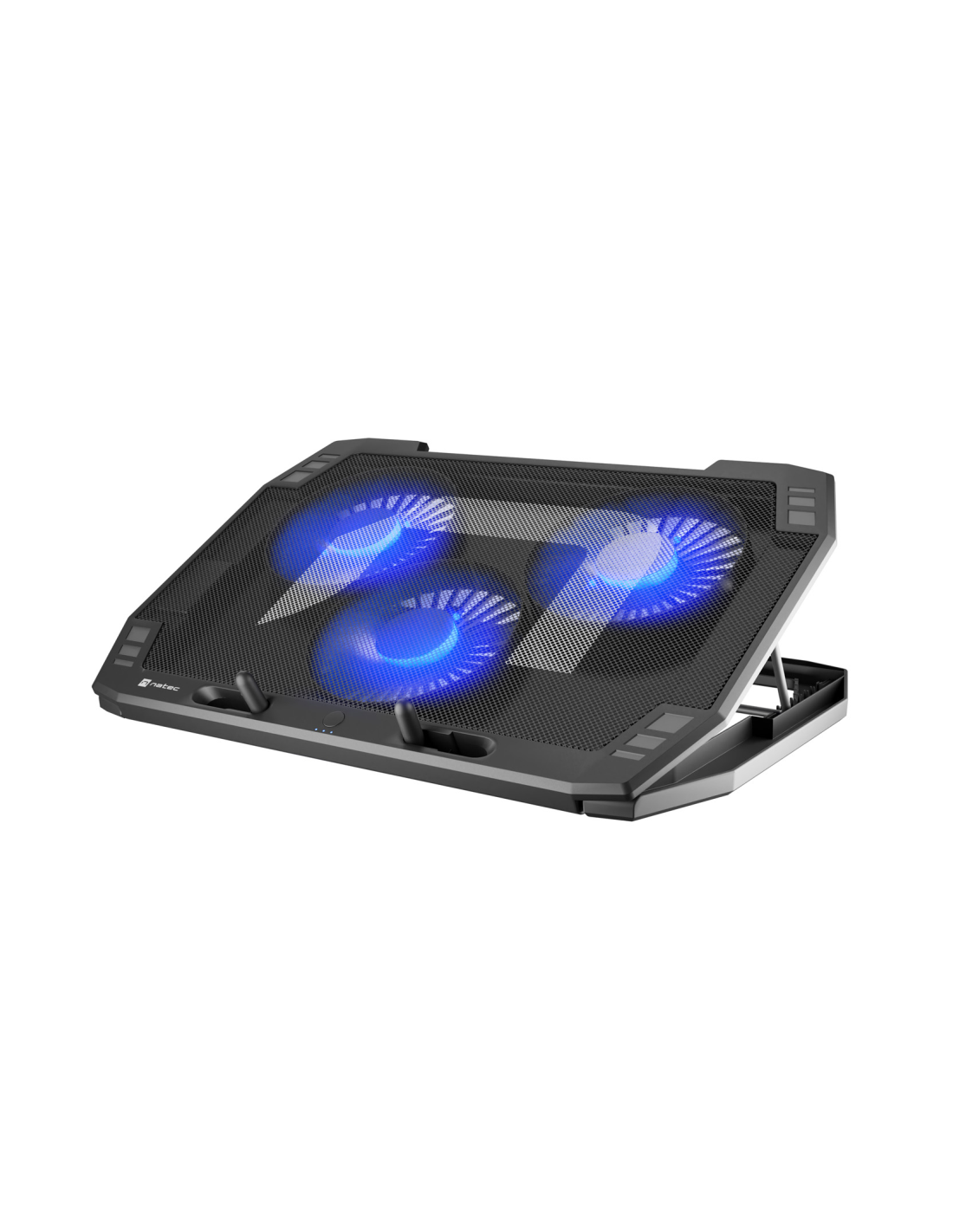 NATEC Oriole. Tamaño máximo de pantalla: 43,9 cm (17.3"), Número de ventiladores incluidos: 3 pieza(s), Diámetro de ventilador: 12 cm. Color del producto: Negro, Material: Acrilonitrilo butadieno estireno (ABS), Metal, Iluminación de color: Azul. Alimentación: USB, Voltaje de entrada: 5 V. Ancho: 400 mm, Profundidad: 270 mm, Altura: 25 mm. Cables incluidos: USB