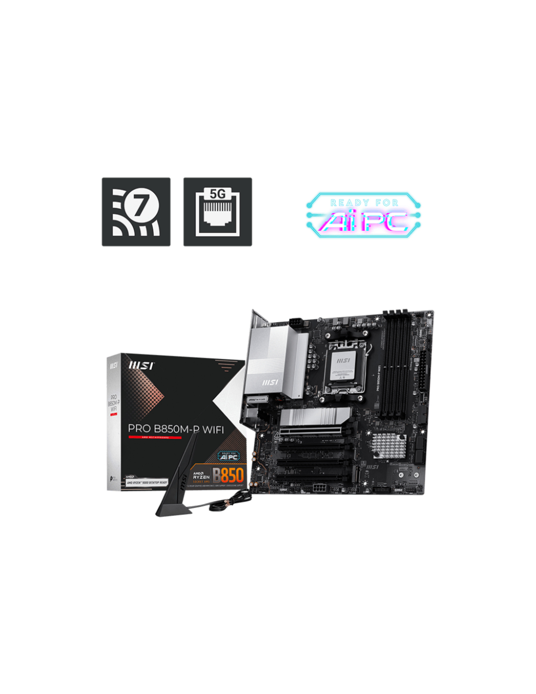 MSI 911-7E71-001. Fabricante de procesador: AMD, Socket de procesador: Zócalo AM5, Procesador compatible: AMD Ryzen 7000 Series, AMD Ryzen 8000 Series, AMD Ryzen 9000 Series. tipos de memoria compatibles: DDR5-SDRAM, Memoria interna máxima: 256 GB, Tipo de ranuras de memoria: DIMM. Interfaces de disco de almacenamiento soportados: M.2, Tipos de unidades de almacenamiento admitidas: HDD & SSD, Niveles RAID: 0, 1, 10. Tipo de interfaz ethernet: 5 Gigabit Ethernet, Estándar Wi-Fi: Wi-Fi 7 (802.11be), Wi-Fi est