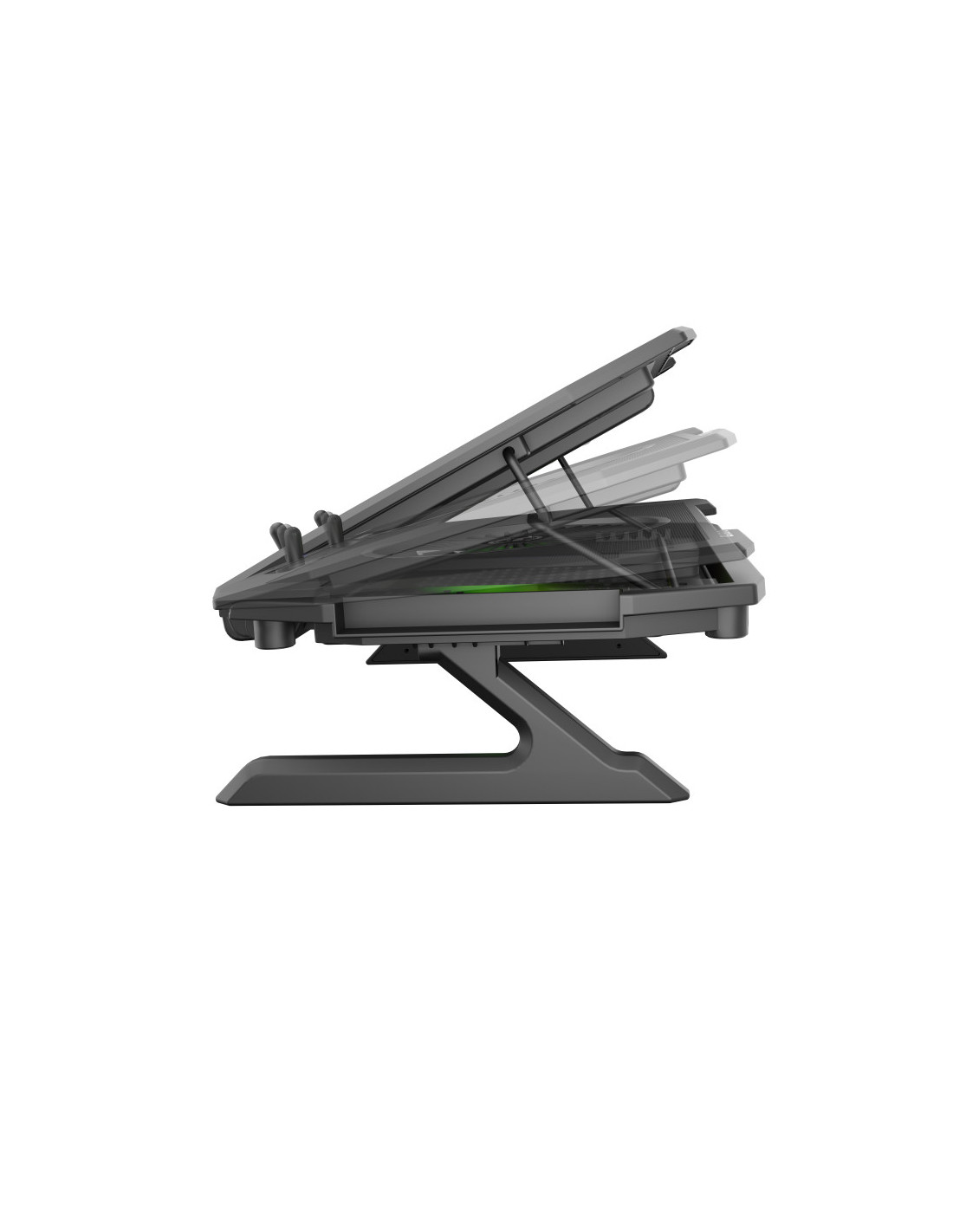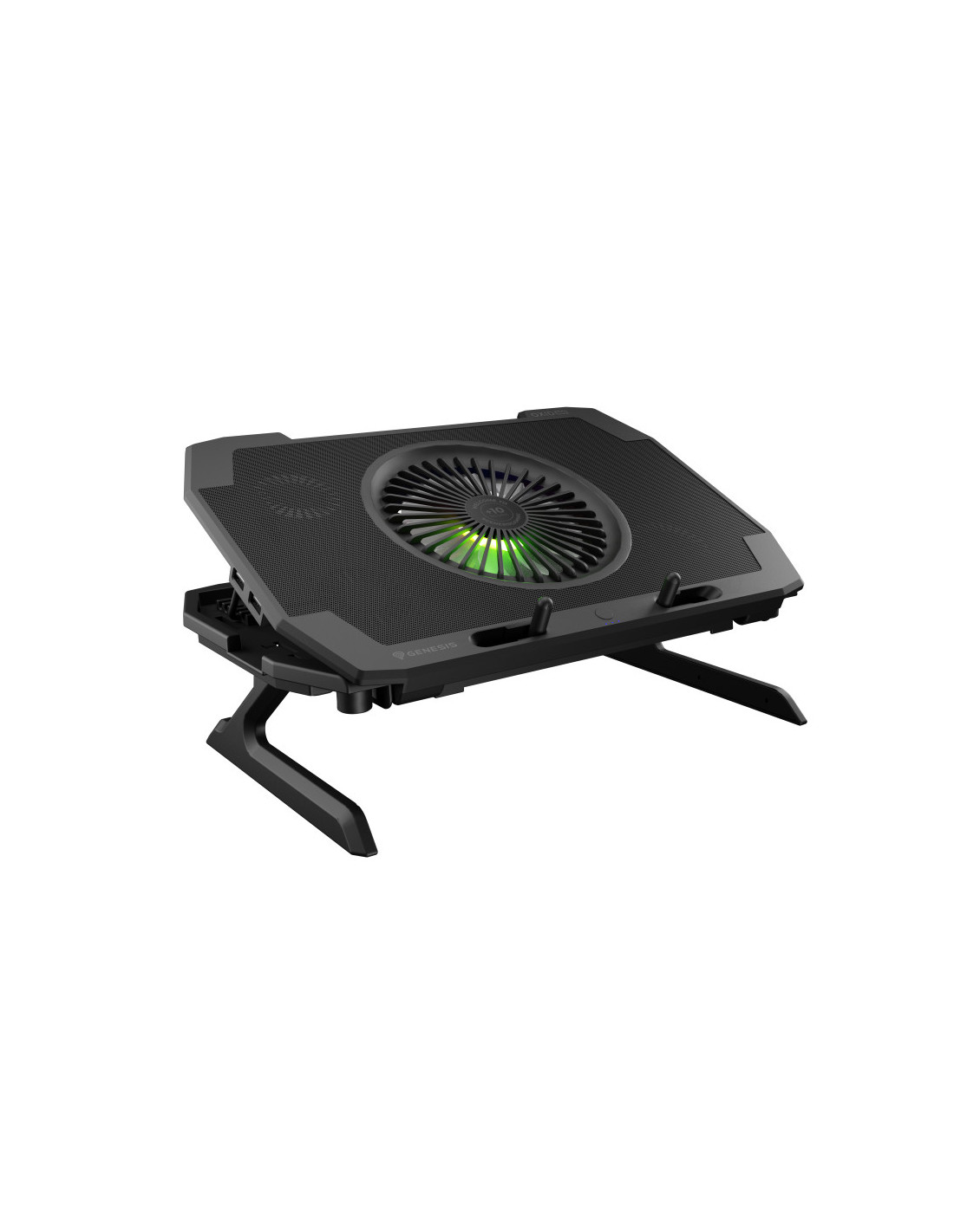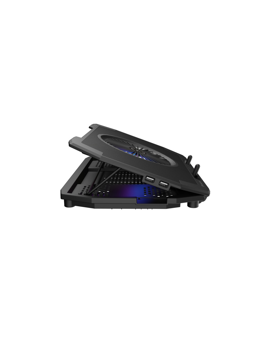 El soporte está equipado con un sistema de refrigeración eficaz y seguro basado en cuatro pequeños ventiladores que extraen el calor de debajo del portátil y un ventilador principal que introduce aire frío en el portátil. La ubicación correcta de los ventiladores garantiza una refrigeración extremadamente eficaz, y el control de velocidad de tres etapas de su rotación reducirá eficazmente la temperatura del portátil incluso durante las batallas más encarnizadas.