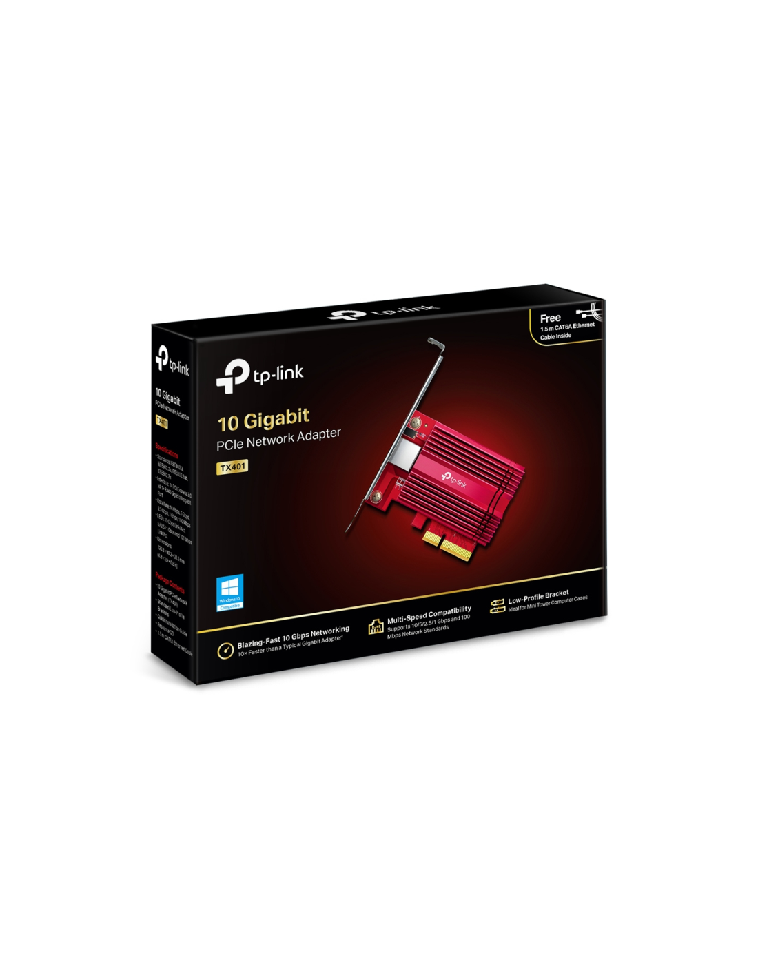 TP-Link TX401. Interno. Tecnología de conectividad: Alámbrico, Interfaz de host: PCI Express, Interfaz: Ethernet. Rango máximo de transferencia de datos: 10000 Mbit/s. Color del producto: Rojo