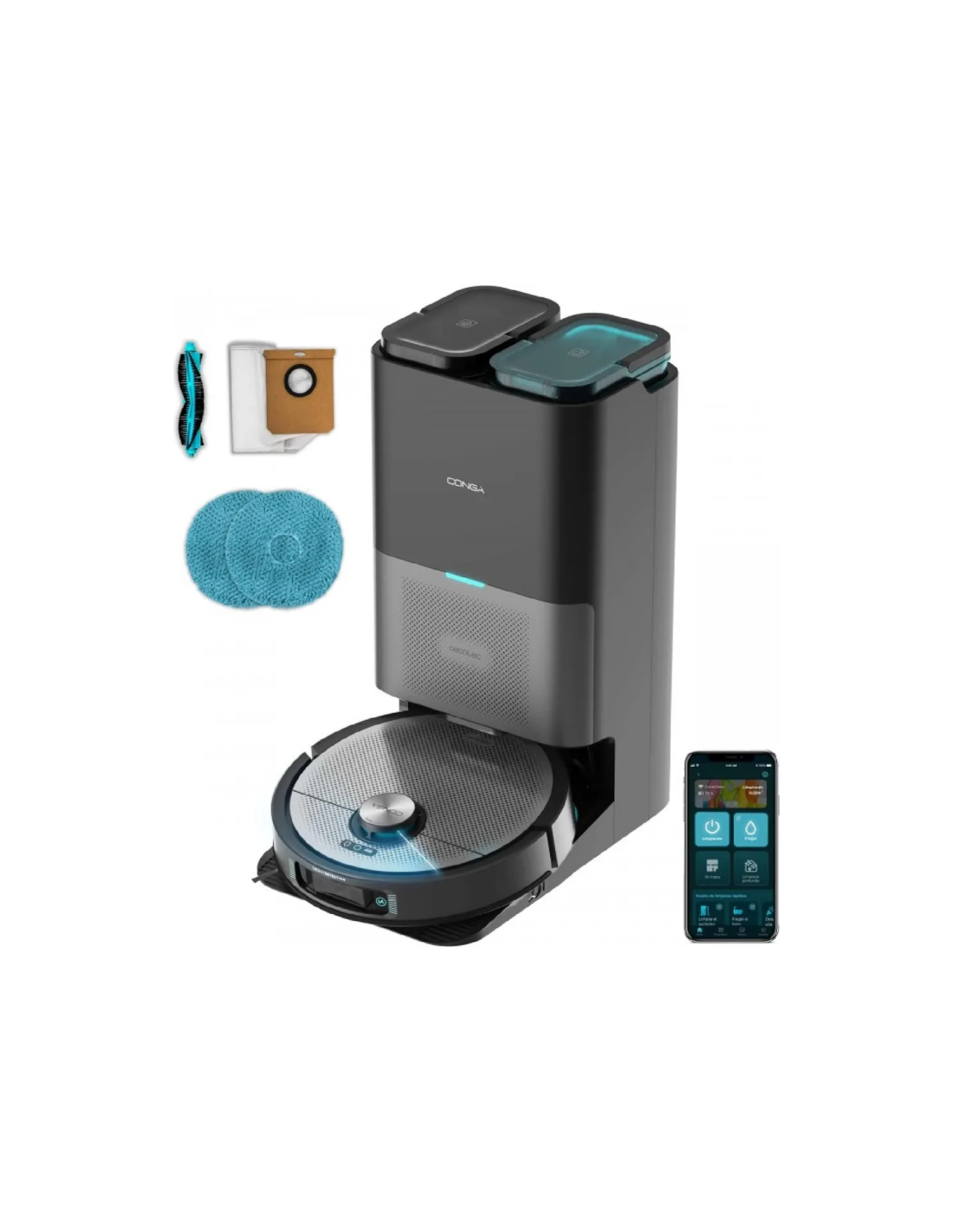 Cecotec Conga 15090 SpinArm Home&Wash. Tipo de depósito: Sin bolsa, Color del producto: Negro, Plata, Forma: Alrededor. Funciones de estación de base: Carga, Programas de limpieza: Alfombra, Edge, Manual, Frecuencia de banda: 2.4 - 5 GHz. Capacidad de batería: 5200 mAh, Tiempo de funcionamiento: 240 min, Durabilidad de la batería: 240 m². Diámetro: 35 cm, Altura: 100 mm, peso total: 35 kg