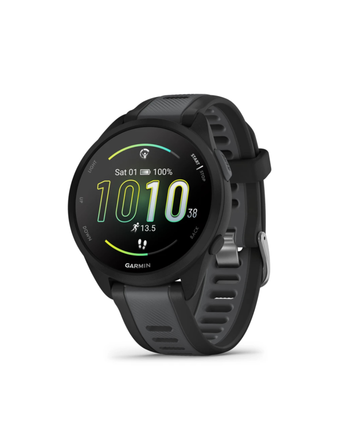 Garmin Forerunner 165. Diagonal de la pantalla: 3,05 cm (1.2"), Tecnología de visualización: AMOLED, Resolución de la pantalla: 390 x 390 Pixeles, Pantalla táctil. Memoria flash: 4 GB. GPS (satélite). Peso: 39 g. Material de la banda: Silicona, Color de banda: Negro, Gris