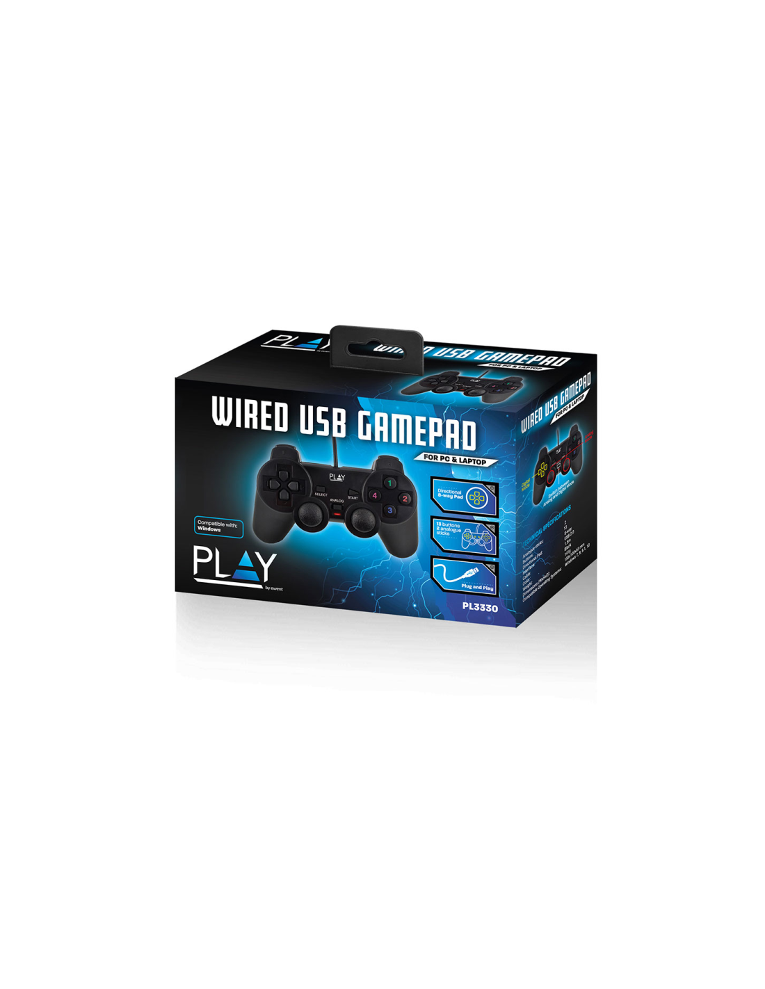 Ewent Play. Tipo de dispositivo: Gamepad, Plataformas de juego soportadas: PC, Botones de función control para gaming: Botón Seleccionar, Botón de arranque. Tecnología de conectividad: Alámbrico, Interfaz del dispositivo: USB 2.0, Conector USB: USB tipo A. Color del producto: Negro, Material de la carcasa: Plástico, Longitud de cable: 1,5 m. Fuente de energía: Cable. Tipo de embalaje: Caja