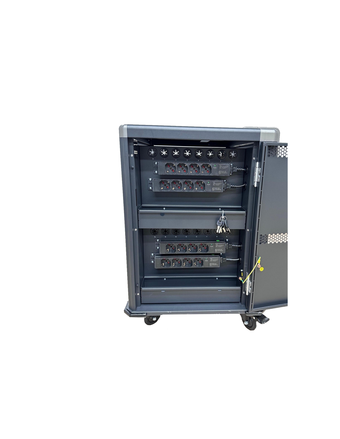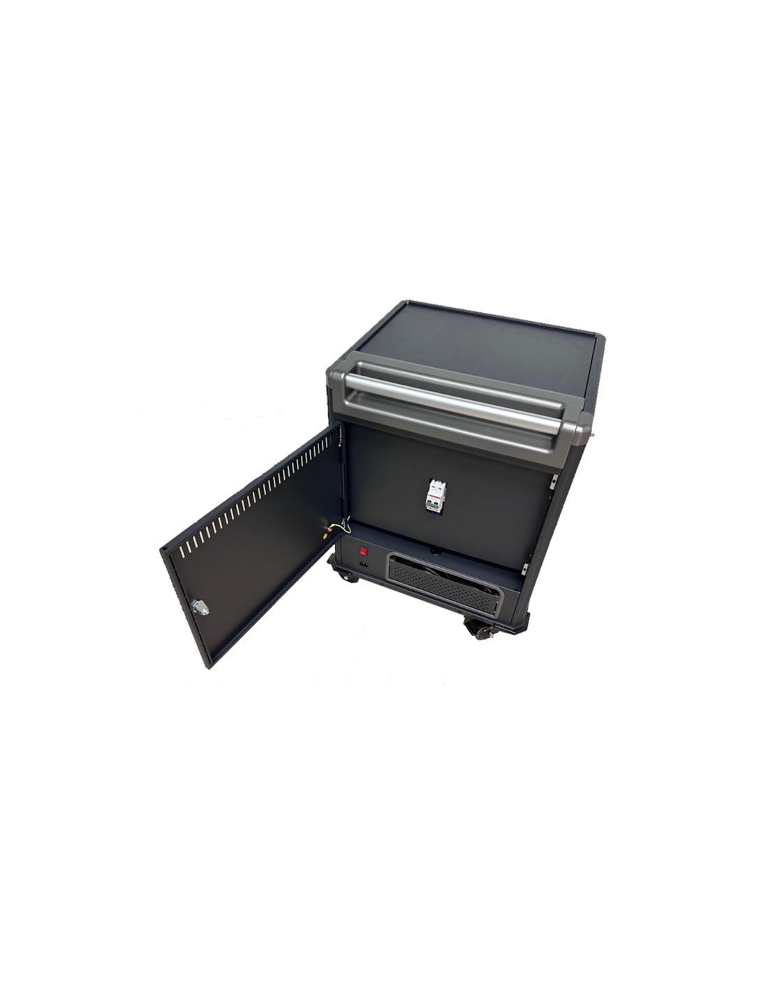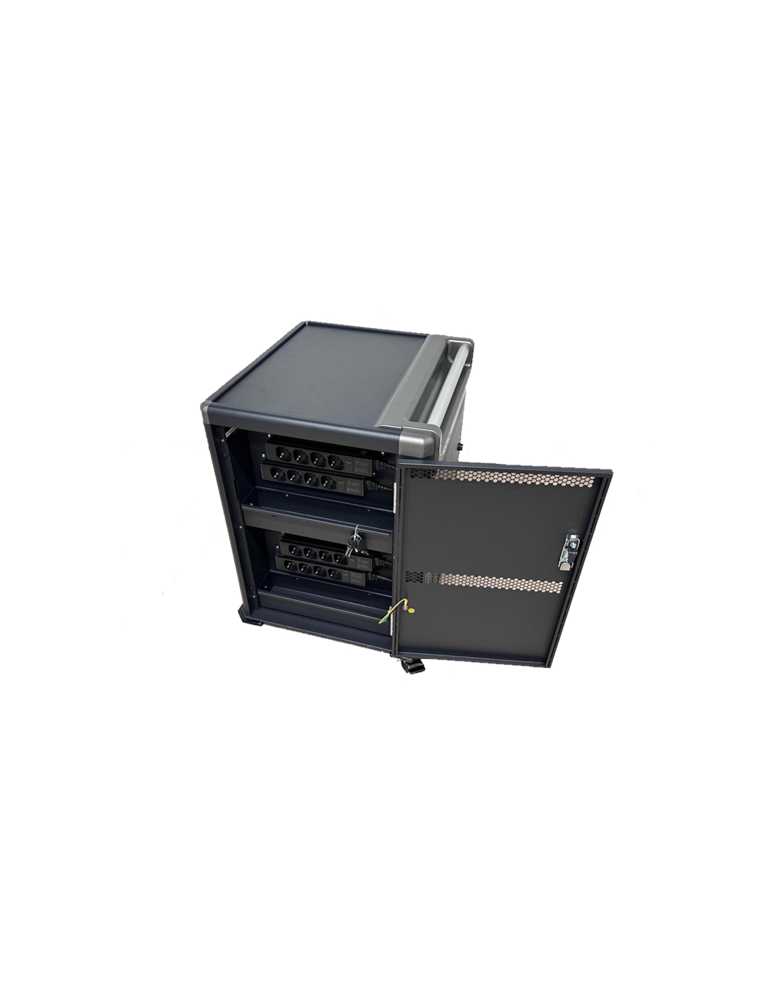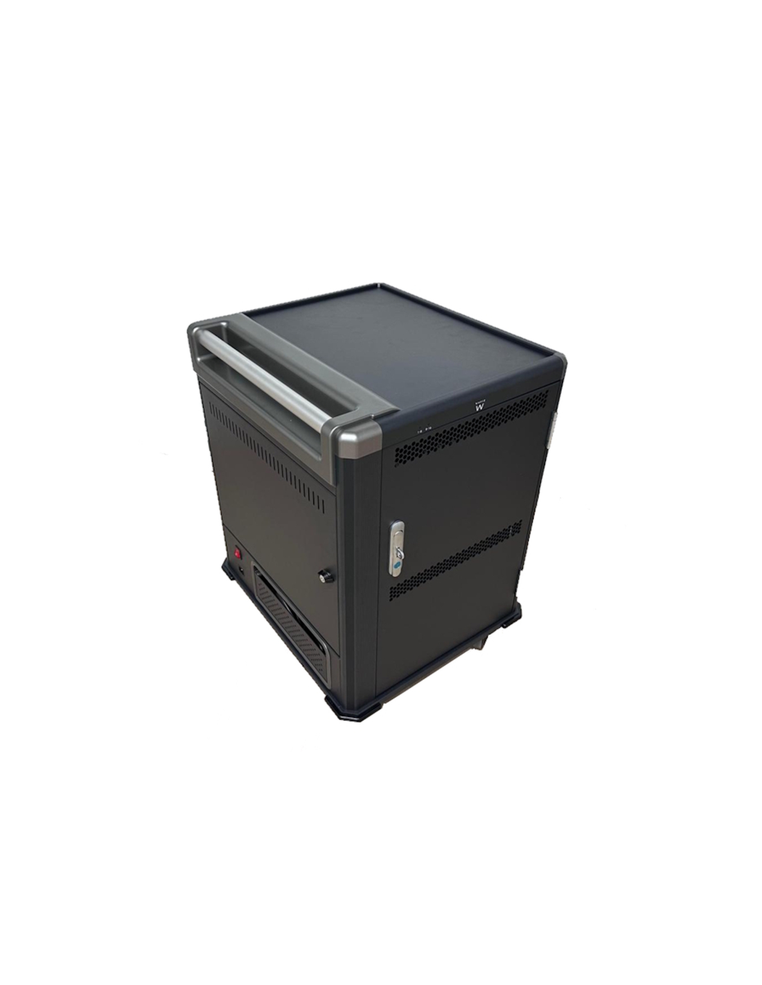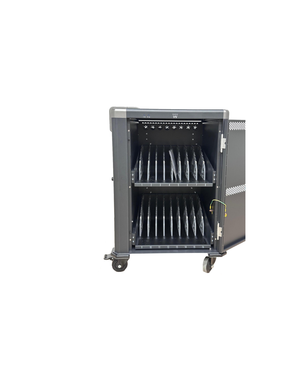 El carro de carga EW1703 le permite proteger, almacenar y cargar fácilmente hasta 16 dispositivos Tablets, Chromebook o portátiles con pantallas de hasta 17". Cuenta con un sistema de carga inteligente, estantes con ranuras para dispositivos flexibles y duraderas, un sistema de administración de cables/fuente de alimentación y, lo mejor de todo, está completamente ensamblado para una implementación rápida. Además, cuenta con espacios numerados para dispositivos y sus correspondientes espacios para suministro de energía para optimizar la organización. El carro también cuenta con puertas ventiladas con un mecanismo de bloqueo con llave de 3 puntos y la opción de agregar su propio candado para mayor seguridad.