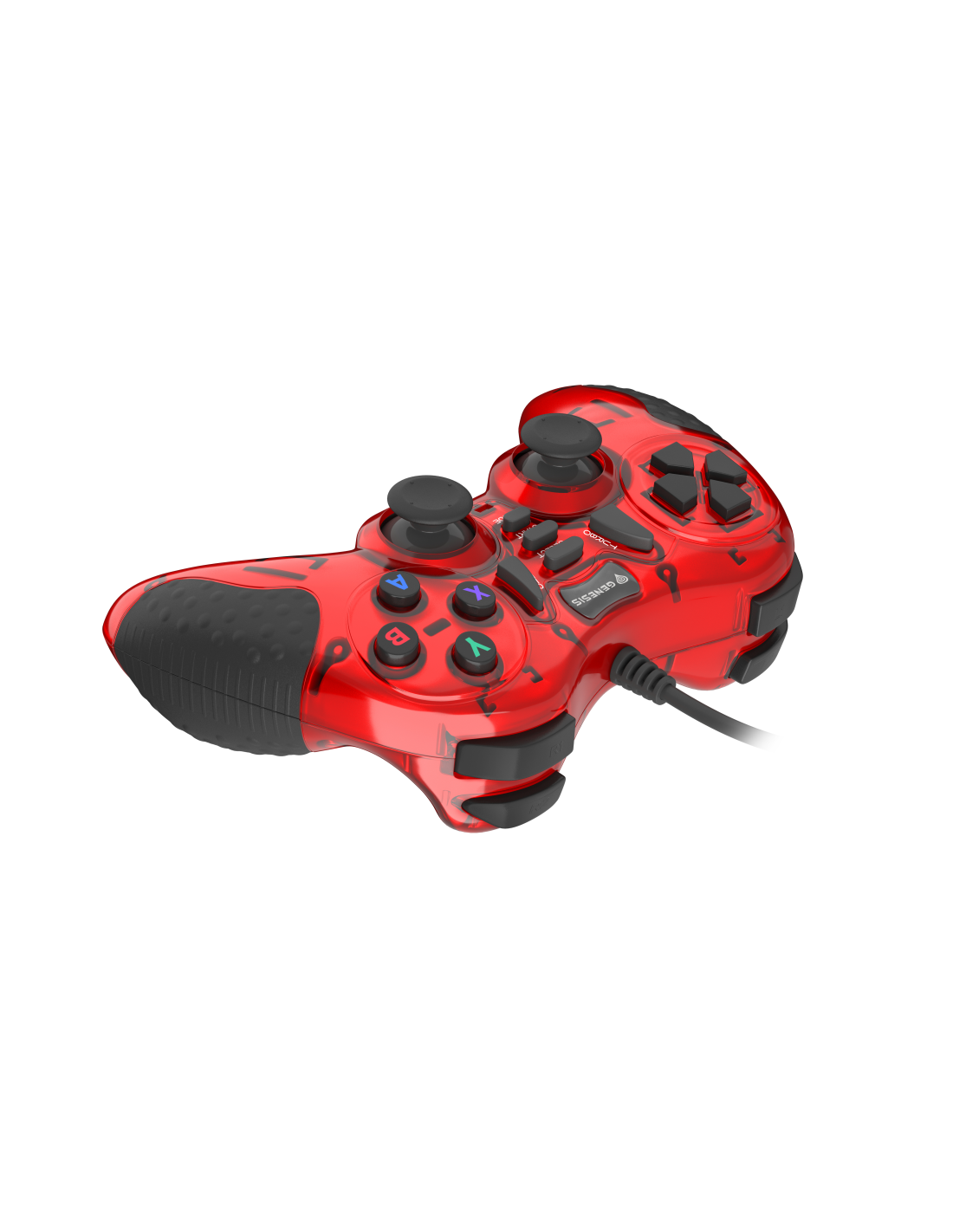 Lo que diferencia al gamepad de Genesis es su increíble diseño. Nos encontramos con el diseño del material rojo y parcialmente transparente que cubre los símbolos. Otorgando al dispositivo un aspecto futurista. La ventaja adicional es el uso de recubrimientos de goma en los laterales del mando. Estos ayudan al jugador a sostener el dispositivo con más confianza en el momento de las partidas más emocionantes.