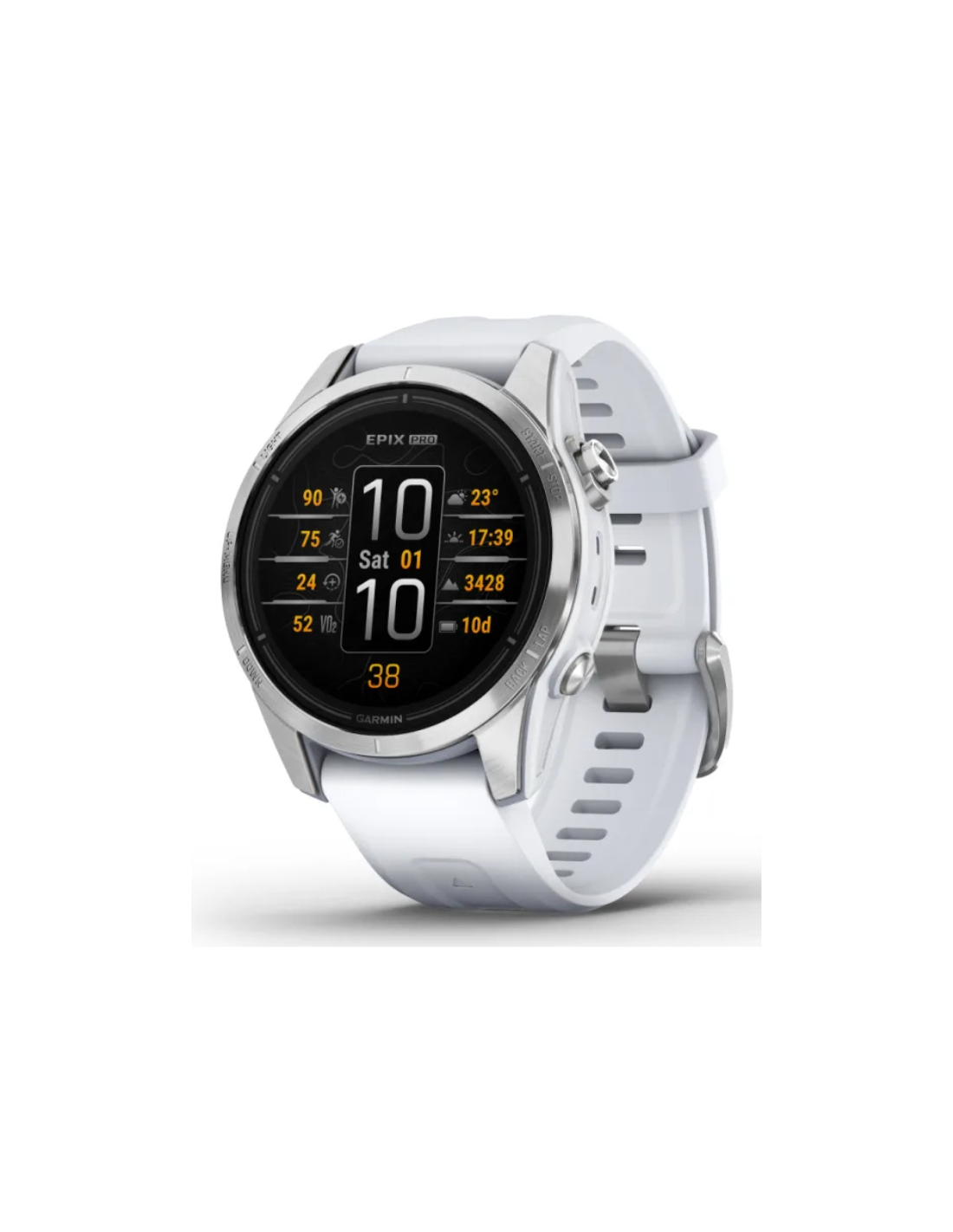 Garmin epix Pro (Gen 2). Diagonal de la pantalla: 3,05 cm (1.2"), Tecnología de visualización: AMOLED, Resolución de la pantalla: 390 x 390 Pixeles, Pantalla táctil. Memoria flash: 32 GB. Wifi. GPS (satélite). Peso: 63 g. Material de la banda: Silicona, Color de banda: Blanco