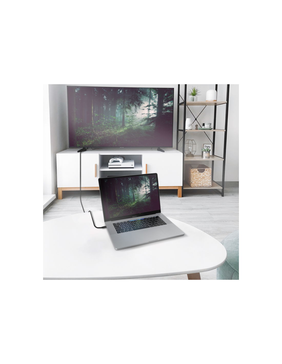 Conversor USB-C a HDMI 2.1, con conector USB-C macho en un extremo y HDMI 8K 2.1 macho en el otro