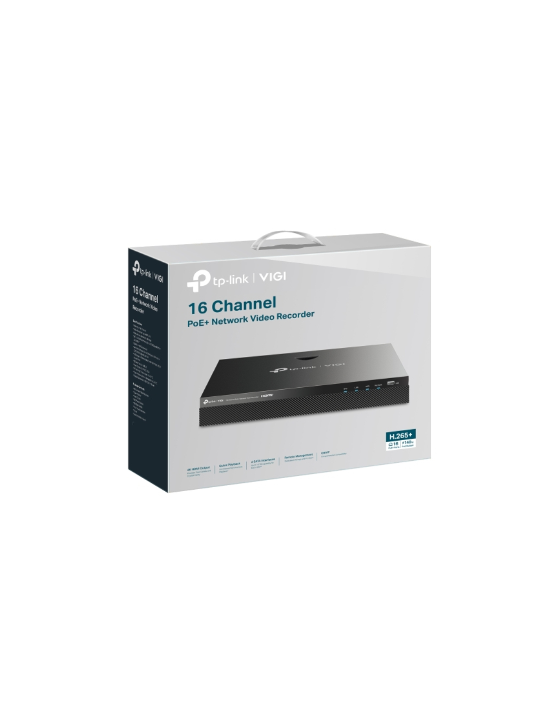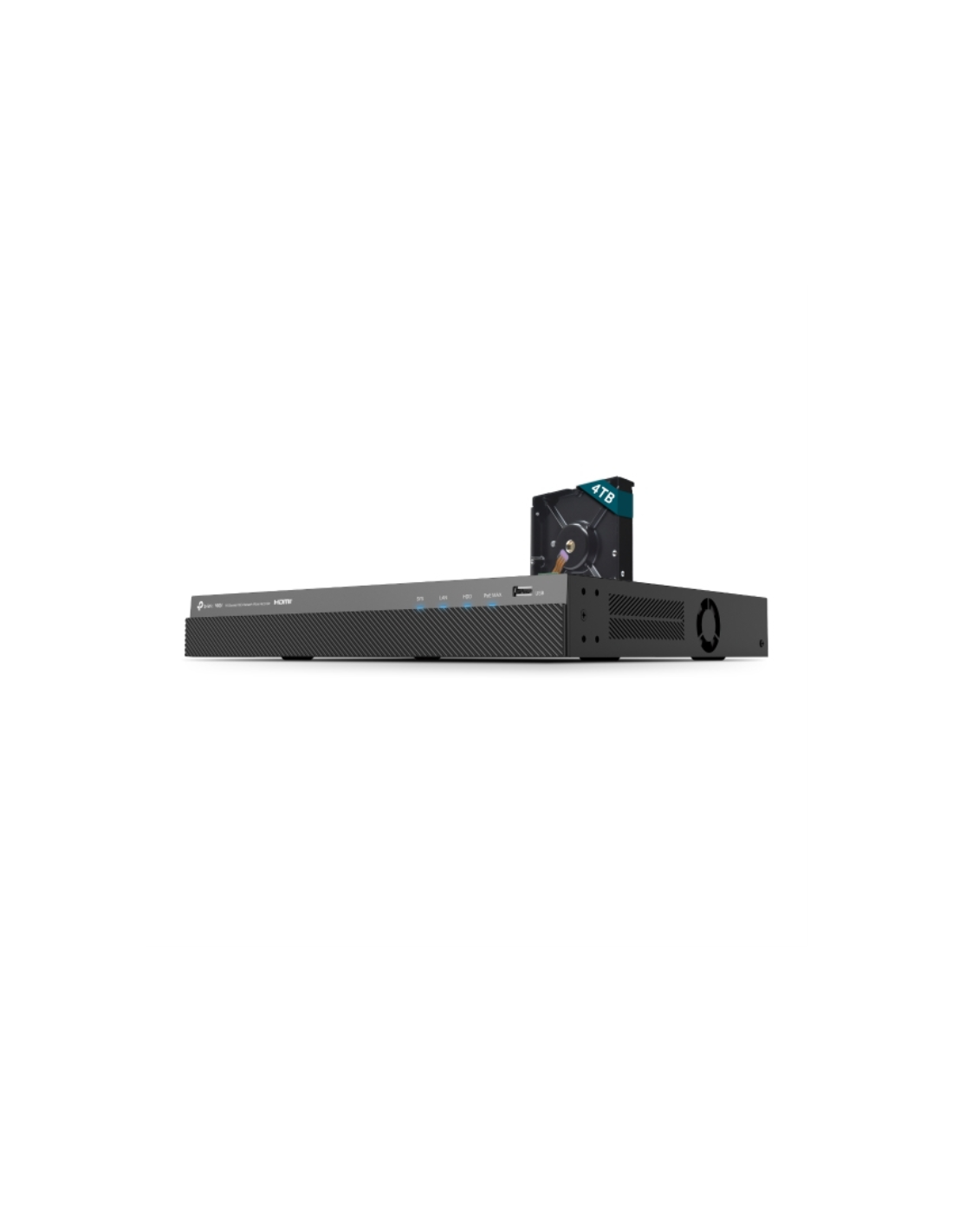 TP-Link VIGI VIGINVR2016H-16MP4TB. Canales de entrada de vídeo: 16 canales, Máxima resolución: 3840 x 2160 Pixeles, Número de canales reproducidos simultáneamente: 16 canales. Capacidad del HDD: 4 TB, Capacidad máxima de almacenaje: 32000 TB, Interfaz del HDD: SATA. Ethernet LAN, velocidad de transferencia de datos: 10,100,1000 Mbit/s, Estándares de red: IEEE 802.3af, IEEE 802.3at. Color del producto: Negro. Consumo de energía (max): 40 W, Consumo energético: 6,2 W, Potencia por puerto de alimentación a tra