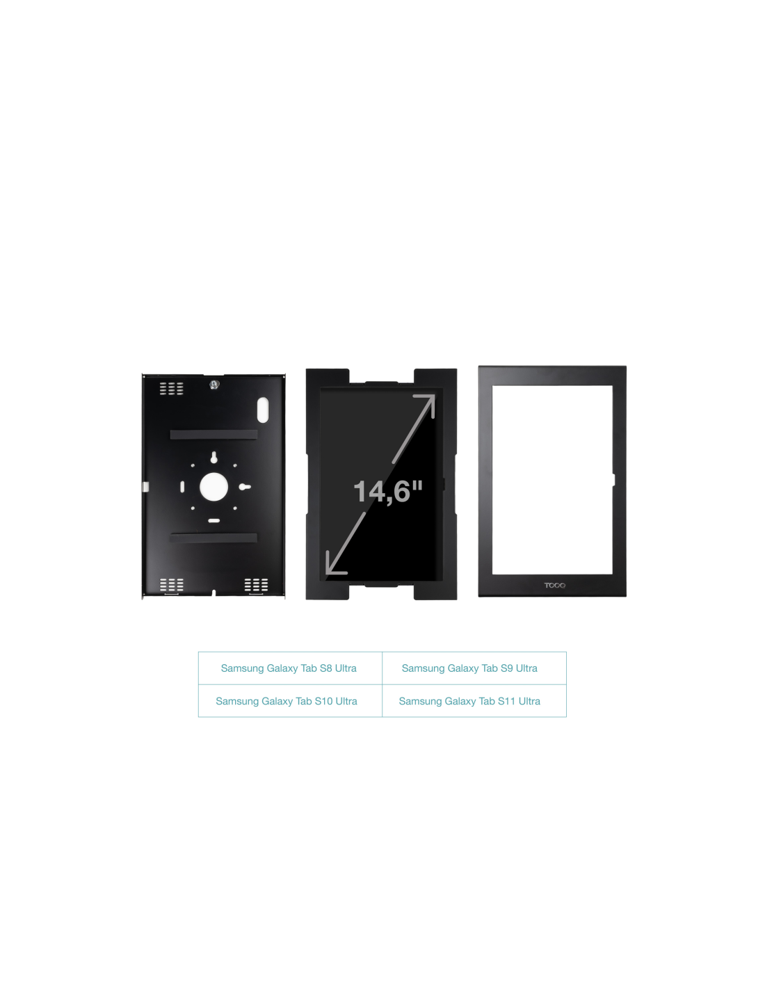 TooQ Marco Antirrobo para Tablets de 14,6”, Negro. Color del producto: Negro, Tamaño máximo de pantalla: 37,1 cm (14.6"), Marca compatible: Samsung. Ancho: 250 mm, Profundidad: 22 mm, Altura: 392 mm. Ancho del paquete: 255 mm, Profundidad del paquete: 400 mm, Altura del paquete: 27 mm. Número de llaves incluidas: 2 pieza(s), Cantidad por paquete: 1 pieza(s)