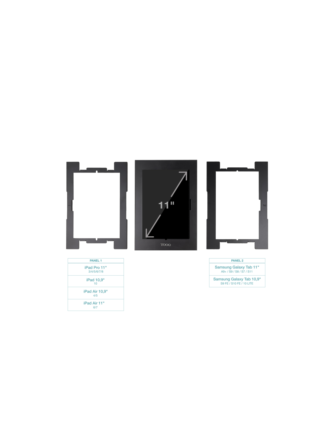 - - 11”: Samsung Galaxy TAB A9+, Samsung Galaxy TAB S9, Samsung Galaxy TAB S8, Samsung Galaxy TAB S7, Samsung Tab S11, iPad Pro3, iPad Pro4, iPad Pro5, iPad Pro6, iPad Pro7, iPad Pro 8, iPad Air6, iPad Air 7.