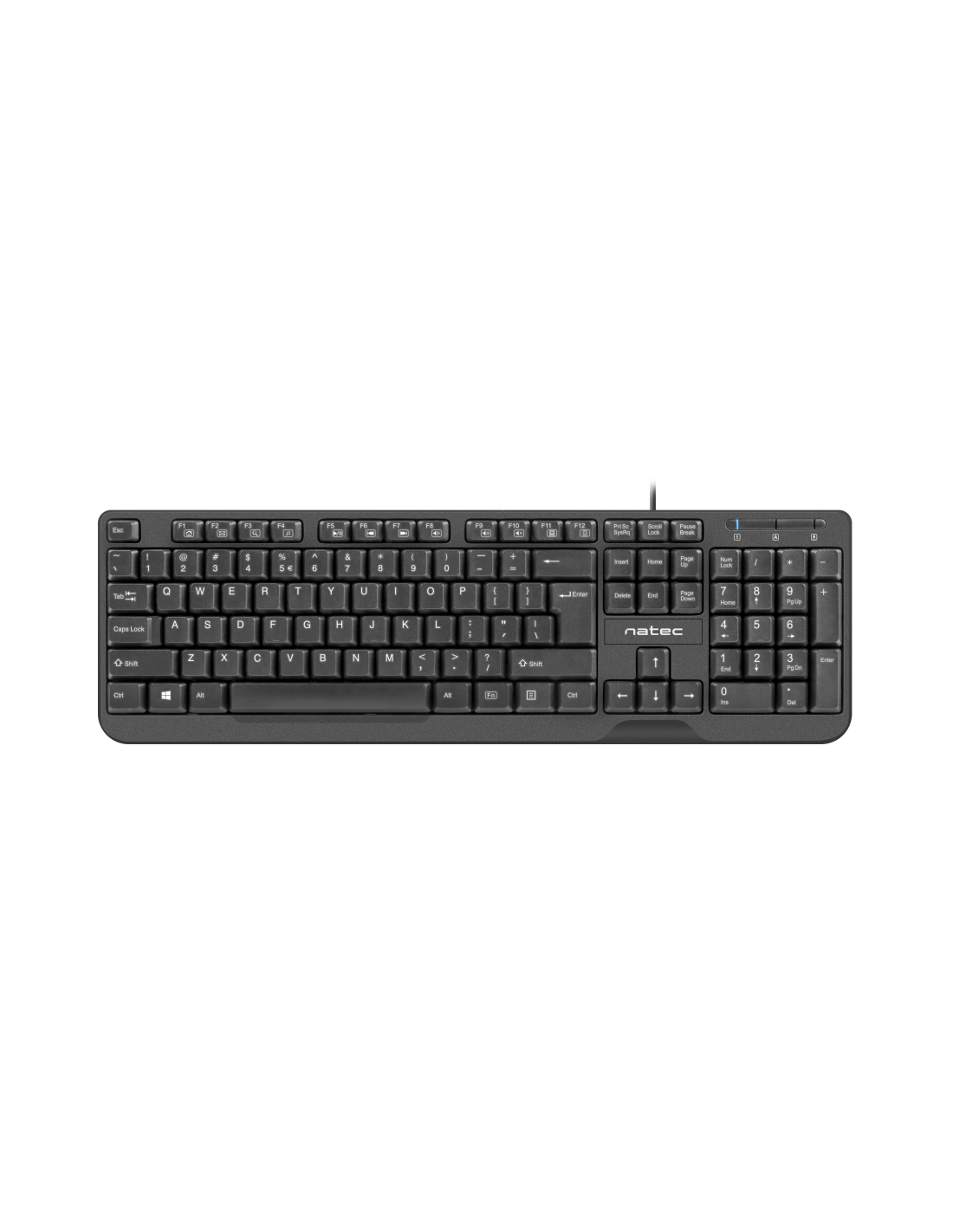 NATEC Trout. Formato del teclado: Completo (100%). Estilo de teclado: Derecho. Tecnología de conectividad: Alámbrico, Interfaz del dispositivo: USB, Interruptor del teclado: Interruptor de membrana, Diseño de teclado: QWERTY, Teclado, cantidad de teclas: 104. Longitud de cable: 1,8 m. Uso recomendado: Oficina. Color del producto: Negro