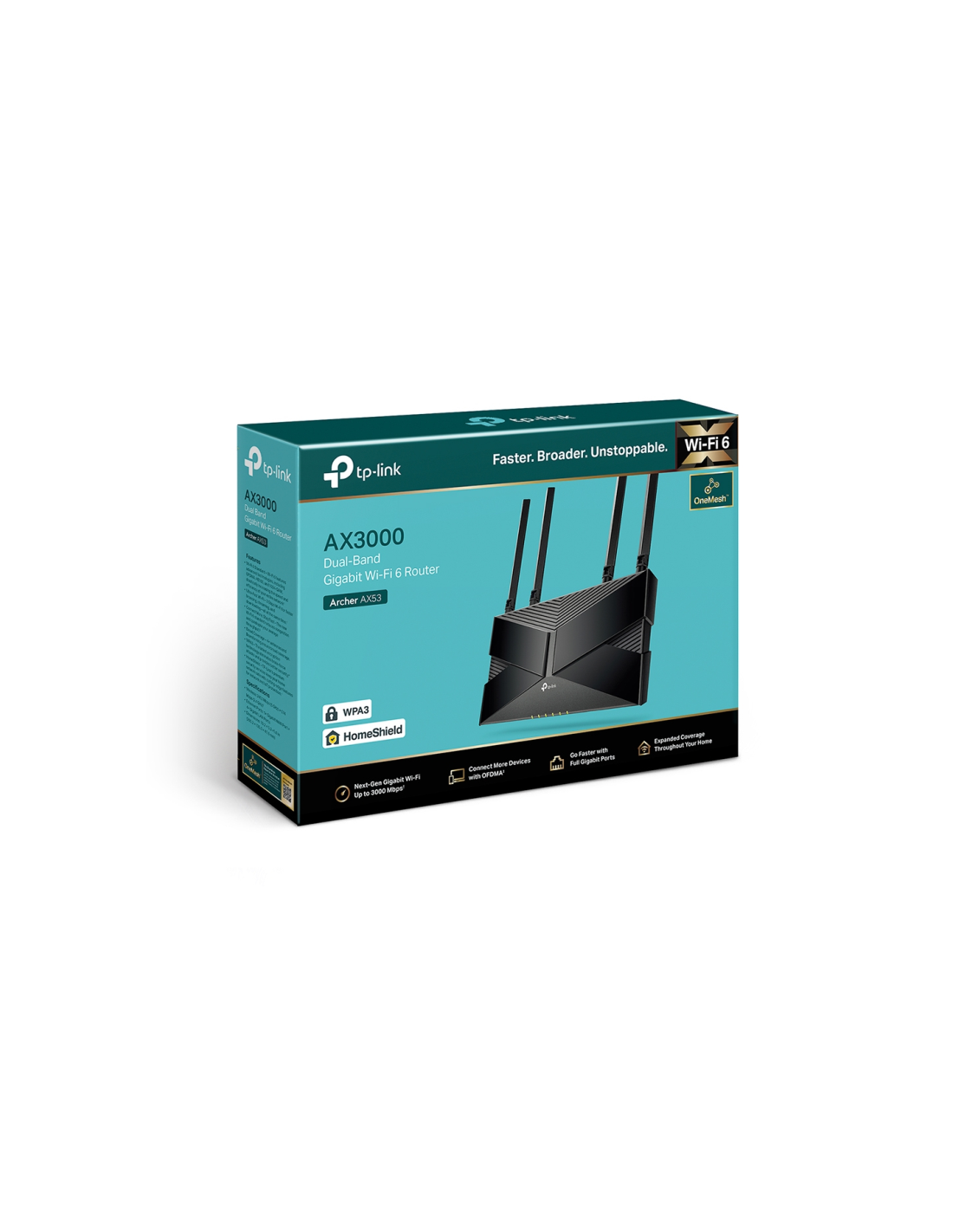 TP-Link Archer AX53. Tipo de conexión WAN: RJ-45. Banda Wi-Fi: Doble banda (2,4 GHz / 5 GHz), Estándar Wi-Fi: Wi-Fi 6 (802.11ax), Tasa de transferencia de datos WLAN (máx.): 2402 Mbit/s. Tipo de interfaz Ethernet LAN: Gigabit Ethernet, Ethernet LAN, velocidad de transferencia de datos: 1000 Mbit/s, Tecnología de cableado: 10/100/1000Base-T(X). Algoritmos de seguridad soportados: WPA, WPA-Enterprise, WPA2, WPA2-Enterprise, WPA3. Protocolos de red compatibles: IPv4, IPv6