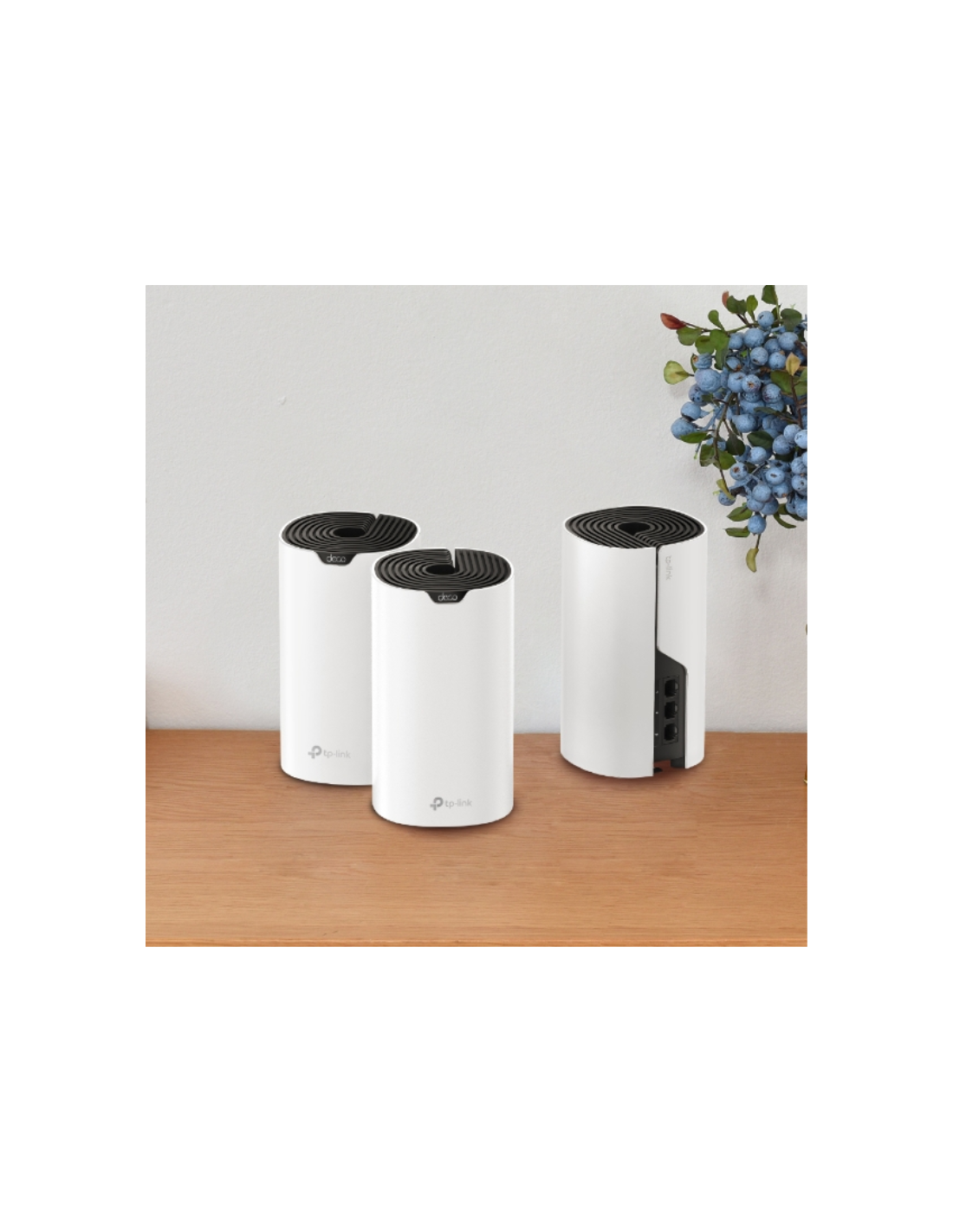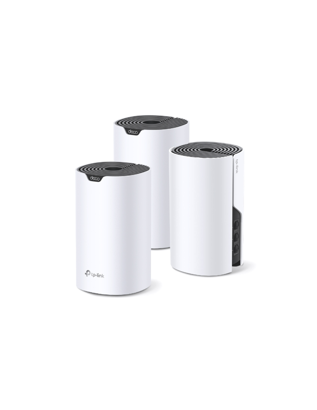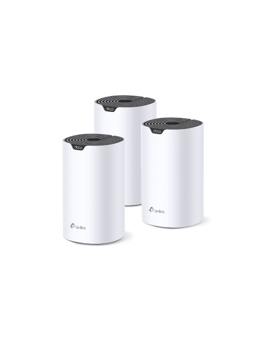 TP-Link Deco S7 (3-pack). Color del producto: Blanco, Negro, Tipo de antena: Interno, Tipo de producto: Sistema de malla. Banda Wi-Fi: Doble banda (2,4 GHz / 5 GHz), Estándar Wi-Fi: Wi-Fi 5 (802.11ac), Tasa de transferencia de datos WLAN (máx.): 1900 Mbit/s. Seguridad con cortafuegos: SPI, Sistemas operativos móviles soportados: Android, iOS. Voltaje de entrada AC: 100 - 240 V, Frecuencia de entrada AC: 50 - 60 Hz, Voltaje de salida de adaptador AC: 12 V. Certificados de conformidad: RoHS, CE, Certificación