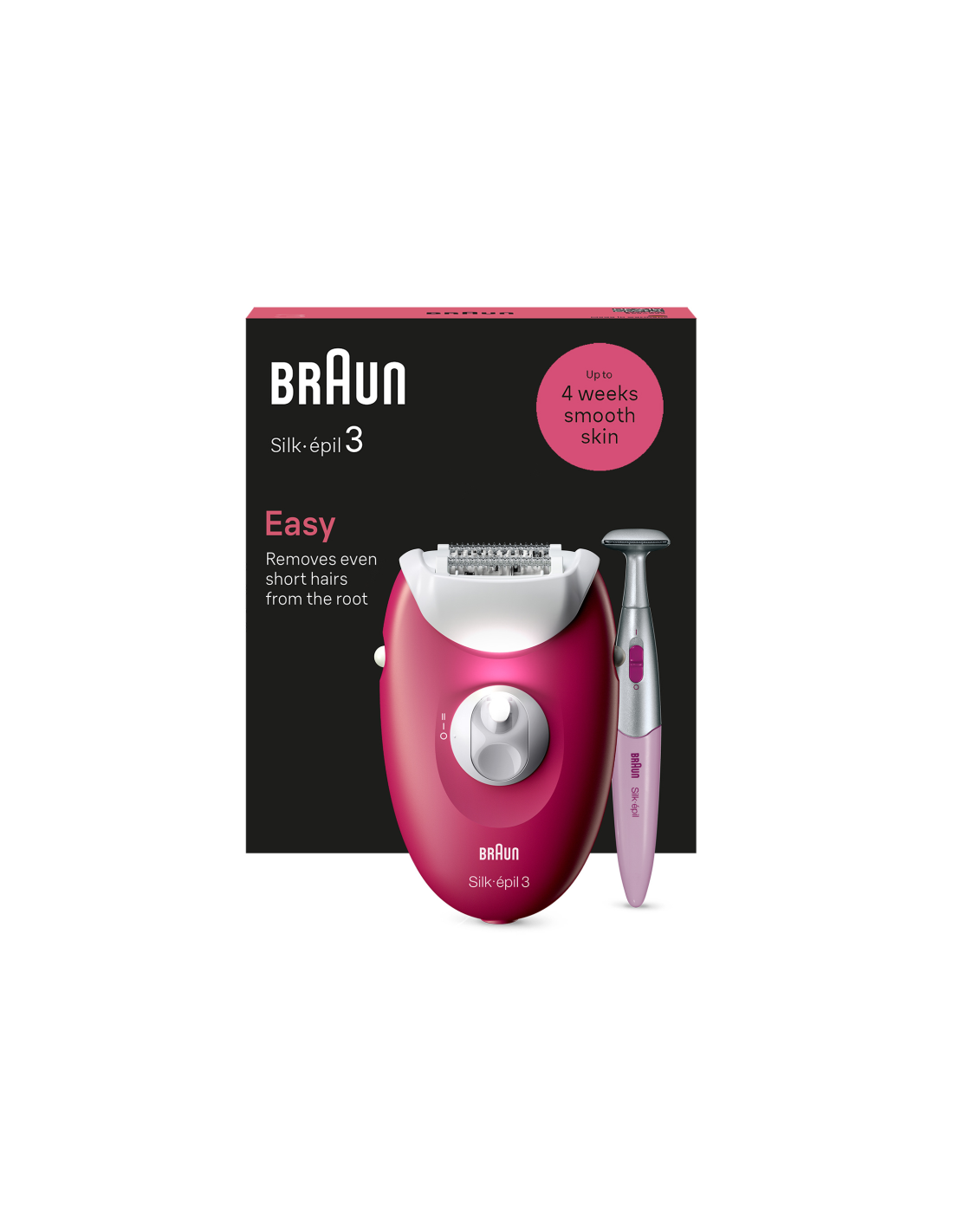 Braun Silk-épil 3 3-202. Color del producto: Fruta del bosque, Número de pinzas: 20 pinzas. Fuente de energía: Corriente alterna, Voltaje de entrada AC: 100-240 V, Frecuencia de entrada AC: 50-60 Hz. País de origen: Alemania. Ancho: 118 mm, Profundidad: 57 mm, Altura: 142 mm. Ancho del paquete: 165 mm, Profundidad del paquete: 235 mm, Altura del paquete: 80 mm