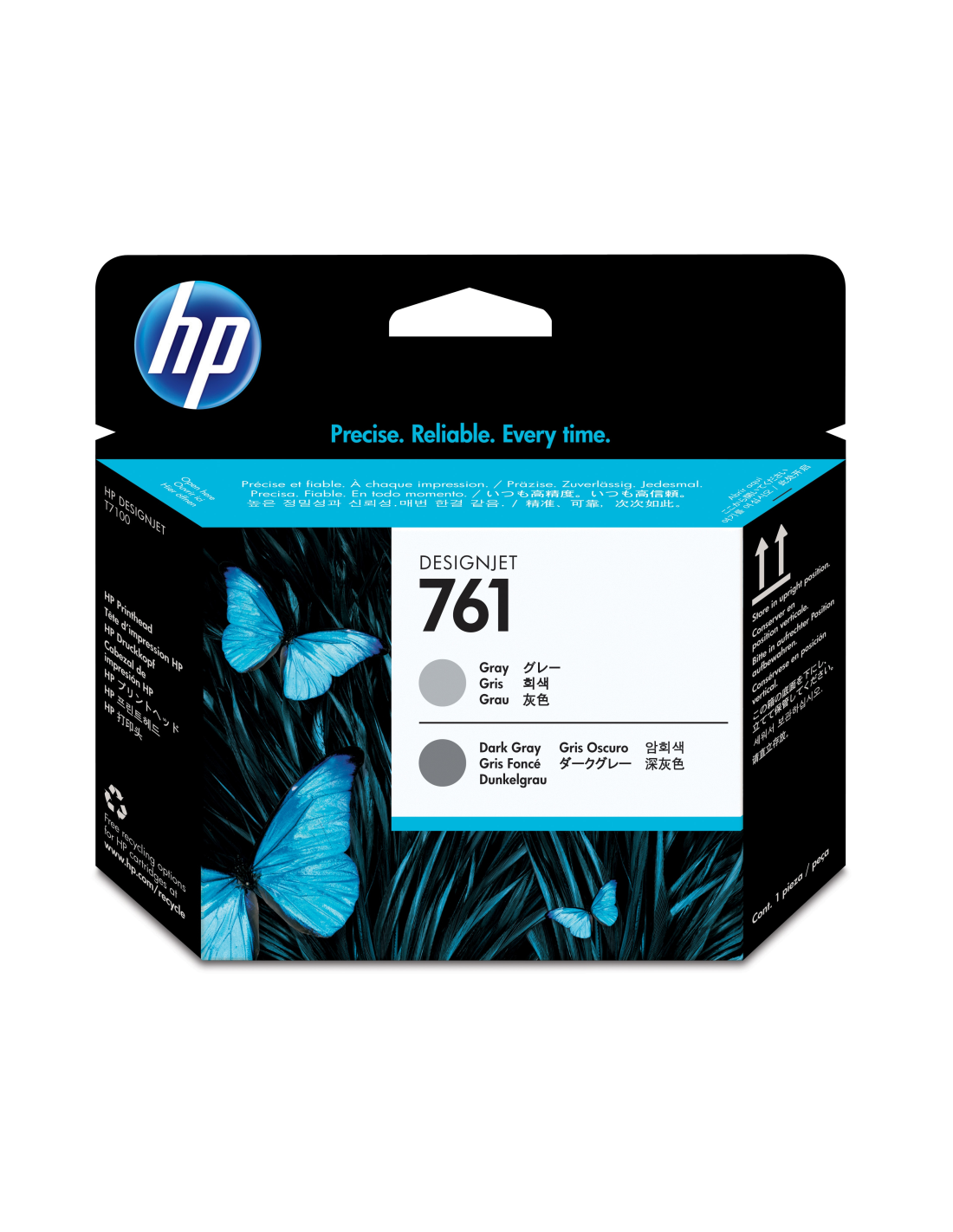 HP Cabezal de impresión Designjet 761 gris/gris oscuro. Compatibilidad: Impresora HP DesignJet T7100, Tecnología de impresión: Inyección de tinta térmica, Colores de impresión: Gris. Ancho: 28 mm, Profundidad: 143 mm, Altura: 132 mm. Dimensiones del embalaje (alto x alto x peso): 28 x 143 x 132 mm, Ancho del paquete: 28 mm, Profundidad del paquete: 143 mm. Número de cajas de cartón por palé: 80 pieza(s), Cantidad por palé: 1920 pieza(s), Número de capas por palé: 10 pieza(s). Cantidad por caja: 1 pieza(s)