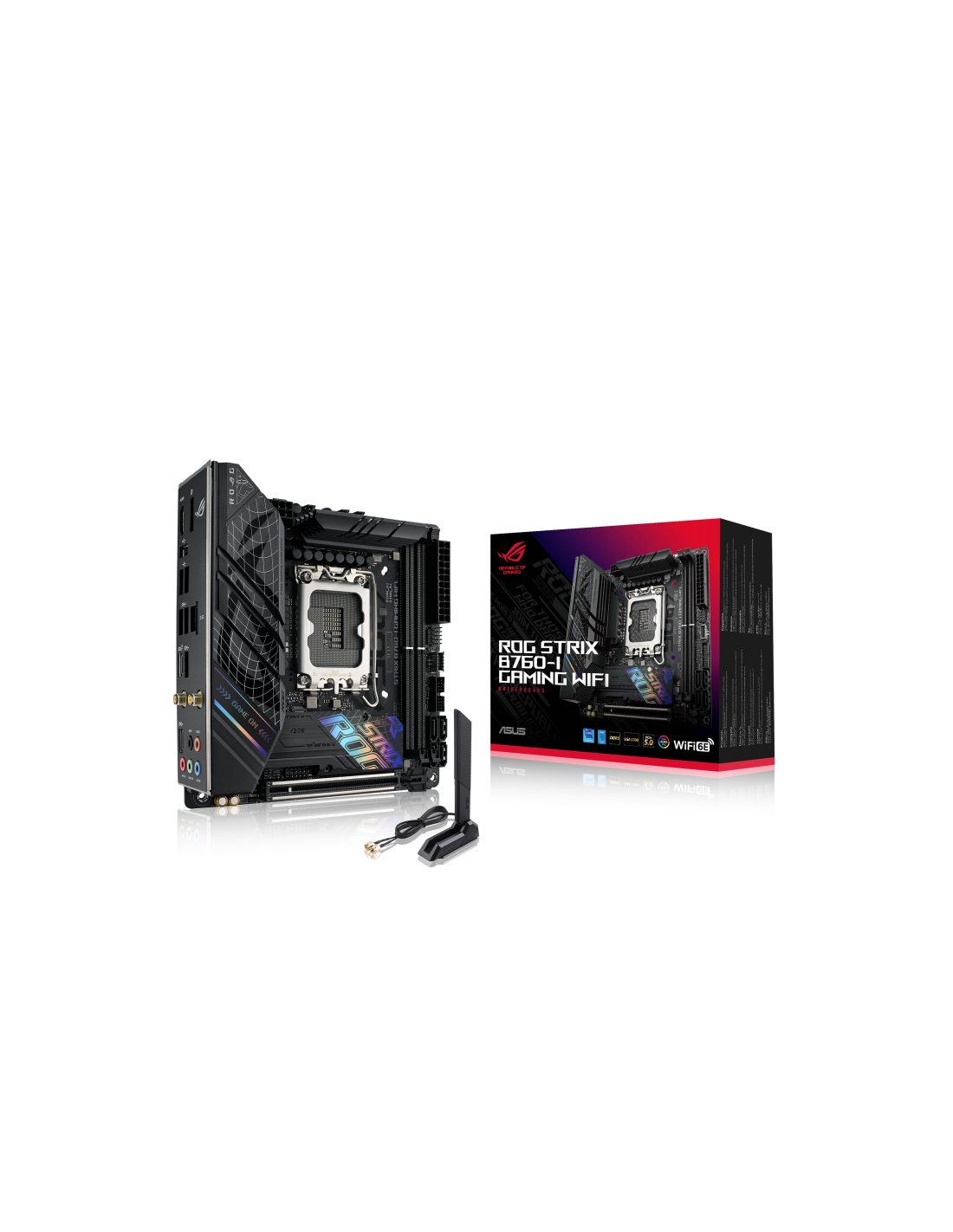 ASUS ROG STRIX B760-I GAMING WIFI. Fabricante de procesador: Intel, Socket de procesador: LGA 1700, Procesador compatible: Intel® Celeron®, Intel® Core™ i3, Intel® Core™ i5, Intel® Core™ i7, Intel® Core™ i9,.... tipos de memoria compatibles: DDR5-SDRAM, Memoria interna máxima: 64 GB, Tipo de ranuras de memoria: DIMM. Interfaces de disco de almacenamiento soportados: M.2, SATA III, Tipos de unidades de almacenamiento admitidas: HDD & SSD, Niveles RAID: 0, 1, 5, 10. Tipo de interfaz ethernet: 2.5 Gigabit Ethe