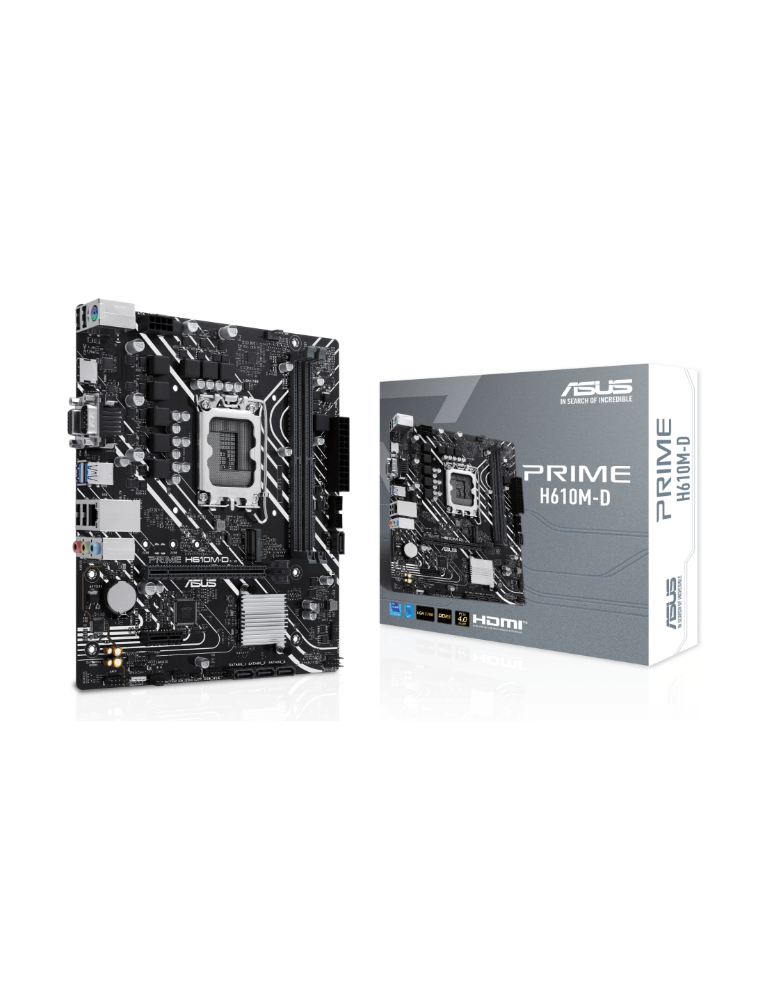 ASUS PRIME H610M-D. Fabricante de procesador: Intel, Socket de procesador: LGA 1700, Procesador compatible: Intel® Celeron®, Intel® Pentium® Gold, Intel® Core™ i3, Intel® Core™ i5, Intel® Core™.... tipos de memoria compatibles: DDR5-SDRAM, Memoria interna máxima: 96 GB, Tipo de ranuras de memoria: DIMM. Interfaces de disco de almacenamiento soportados: M.2, SATA III, Tipos de unidades de almacenamiento admitidas: HDD & SSD. Tipo de interfaz ethernet: Gigabit Ethernet. Componente para: PC, Factor de forma: m