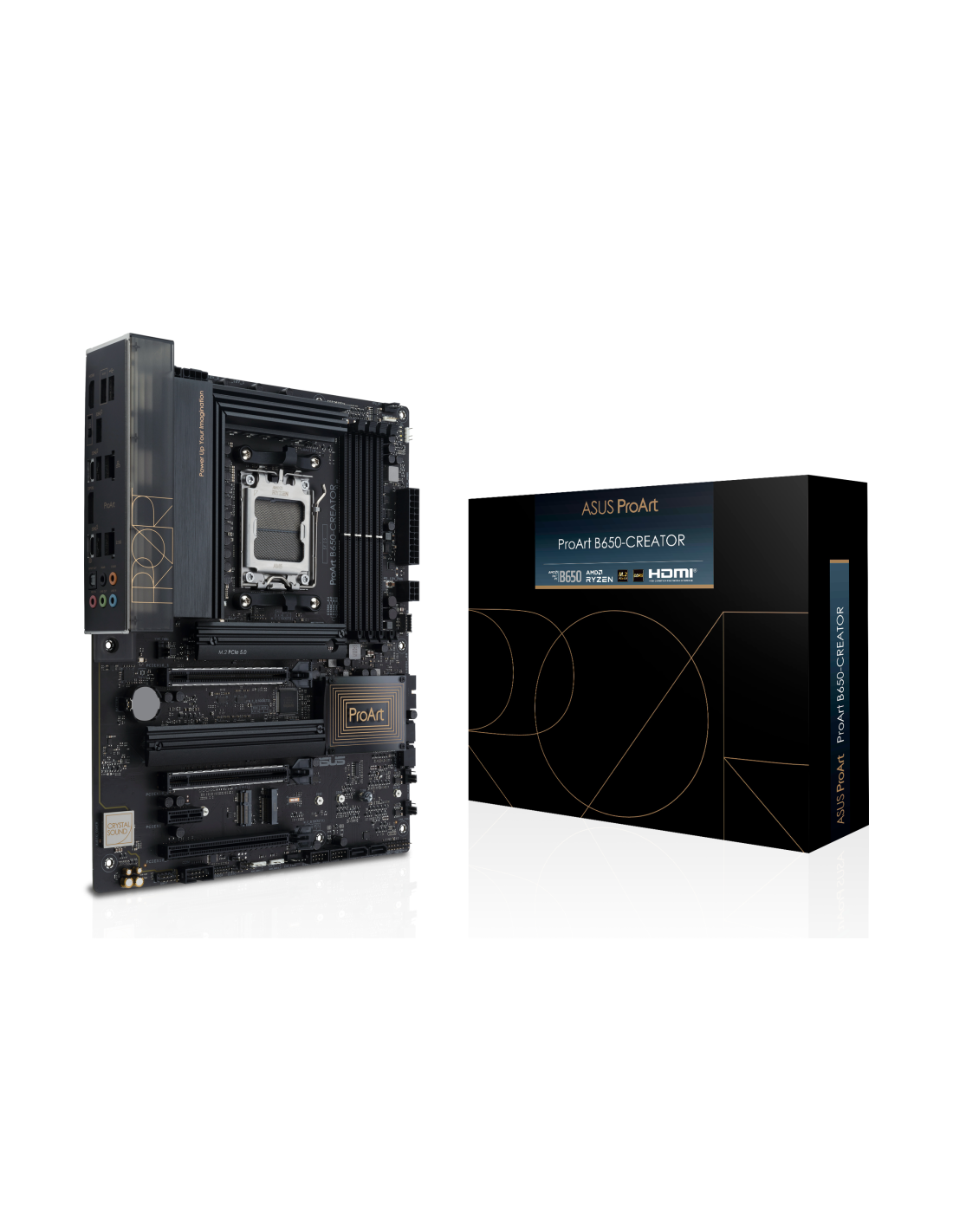 ASUS PROART B650-CREATOR. Fabricante de procesador: AMD, Socket de procesador: Zócalo AM5, Procesador compatible: AMD Ryzen 7000 Series. tipos de memoria compatibles: DDR5-SDRAM, Memoria interna máxima: 128 GB, Tipo de ranuras de memoria: DIMM. Interfaces de disco de almacenamiento soportados: M.2, SATA III, Tipos de unidades de almacenamiento admitidas: HDD & SSD, Niveles RAID: 0, 1, 10. Tipo de interfaz ethernet: 2.5 Gigabit Ethernet, Gigabit Ethernet. Componente para: PC, Factor de forma: ATX, Familia de