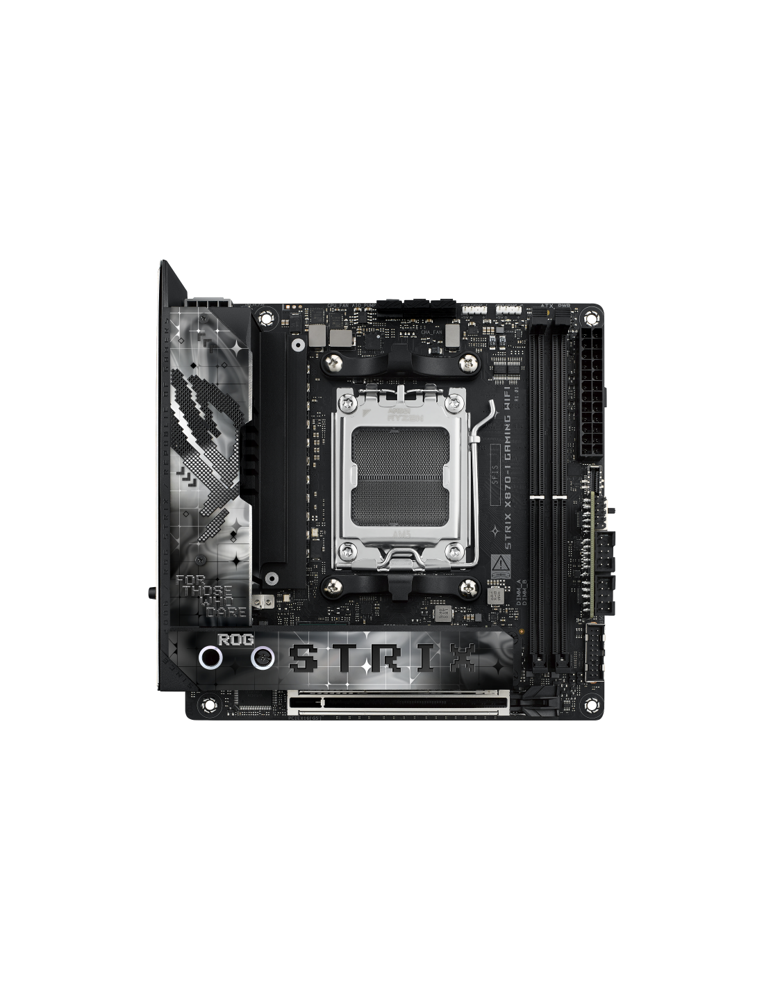 ASUS ROG STRIX X870-I GAMING WIFI. Fabricante de procesador: AMD, Socket de procesador: Zócalo AM5, Procesador compatible: AMD Ryzen 7000 Series, AMD Ryzen 8000 Series, AMD Ryzen 9000 Series. tipos de memoria compatibles: DDR5-SDRAM, Memoria interna máxima: 96 GB, Tipo de ranuras de memoria: DIMM. Interfaces de disco de almacenamiento soportados: M.2, SATA III, Tipos de unidades de almacenamiento admitidas: HDD & SSD, Niveles RAID: 0, 1, 10. Conector USB: USB tipo A, USB Tipo C. Tipo de interfaz ethernet: 2
